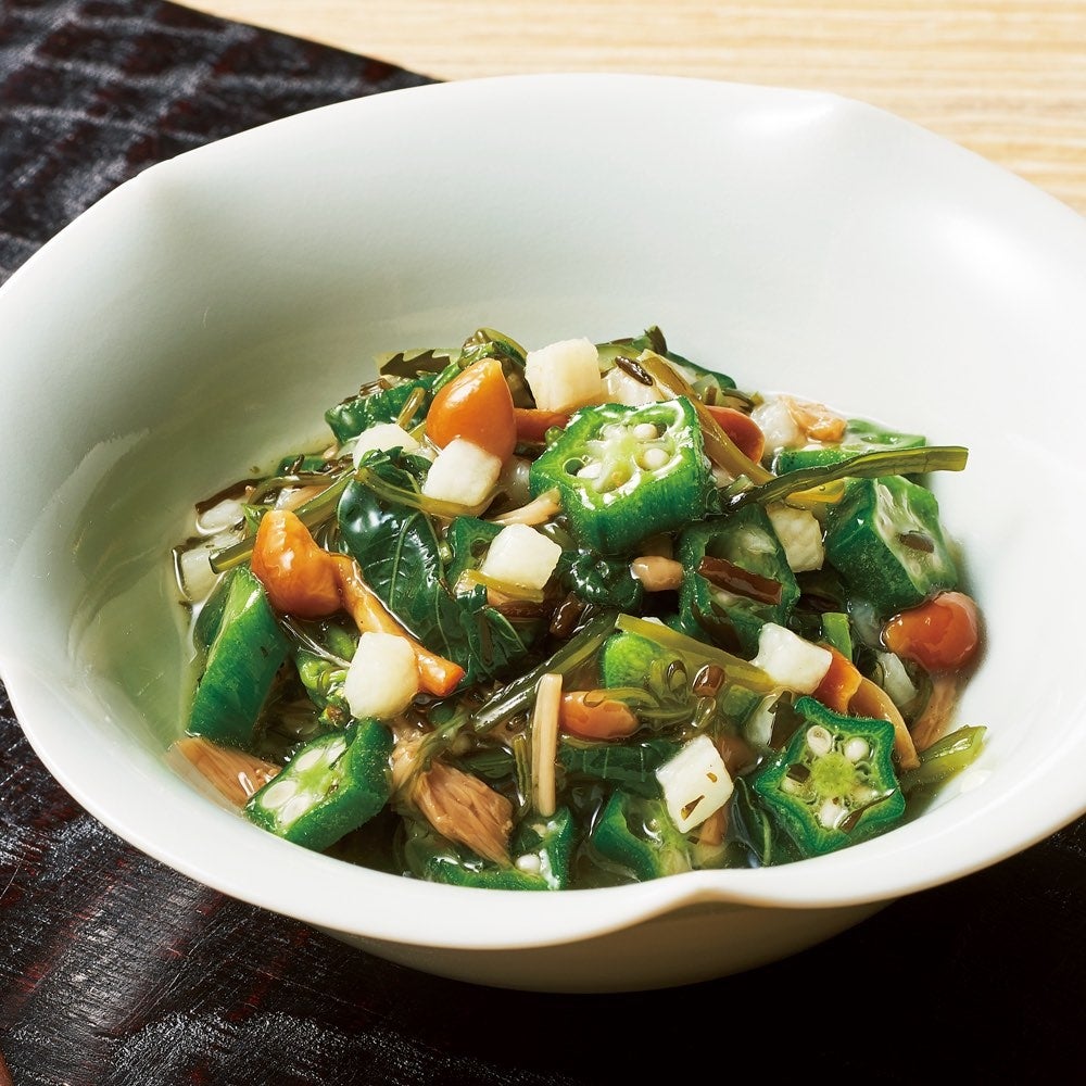 国産の長芋にめかぶ、茎わかめ、アカモクなどの海藻と、オクラ、なめこ、なめ茸、モロヘイヤなど、8種類を合わせたツルリとしたのどごしのネバネバ惣菜。そのままでも、豆腐やサラダ、そばにのせても。1袋50gの食べきりサイズなので食べたい分だけ解凍して召し上がれます。