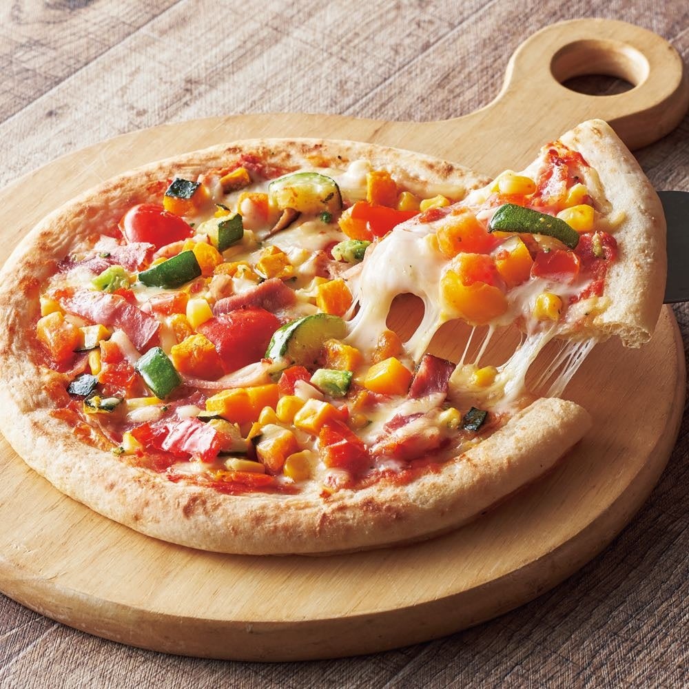 豊富な野菜は、赤と黄のパプリカ、ズッキーニ、なす、ホールコーン、トマトなど8種。選び抜いたチーズ4種とベーコンの旨味が合わさります。ナポリ風の厚みのある生地で食べごたえがあります。さらに、ガーリックが絶妙に調和し、野菜の味が強く感じすぎない配慮をしています。