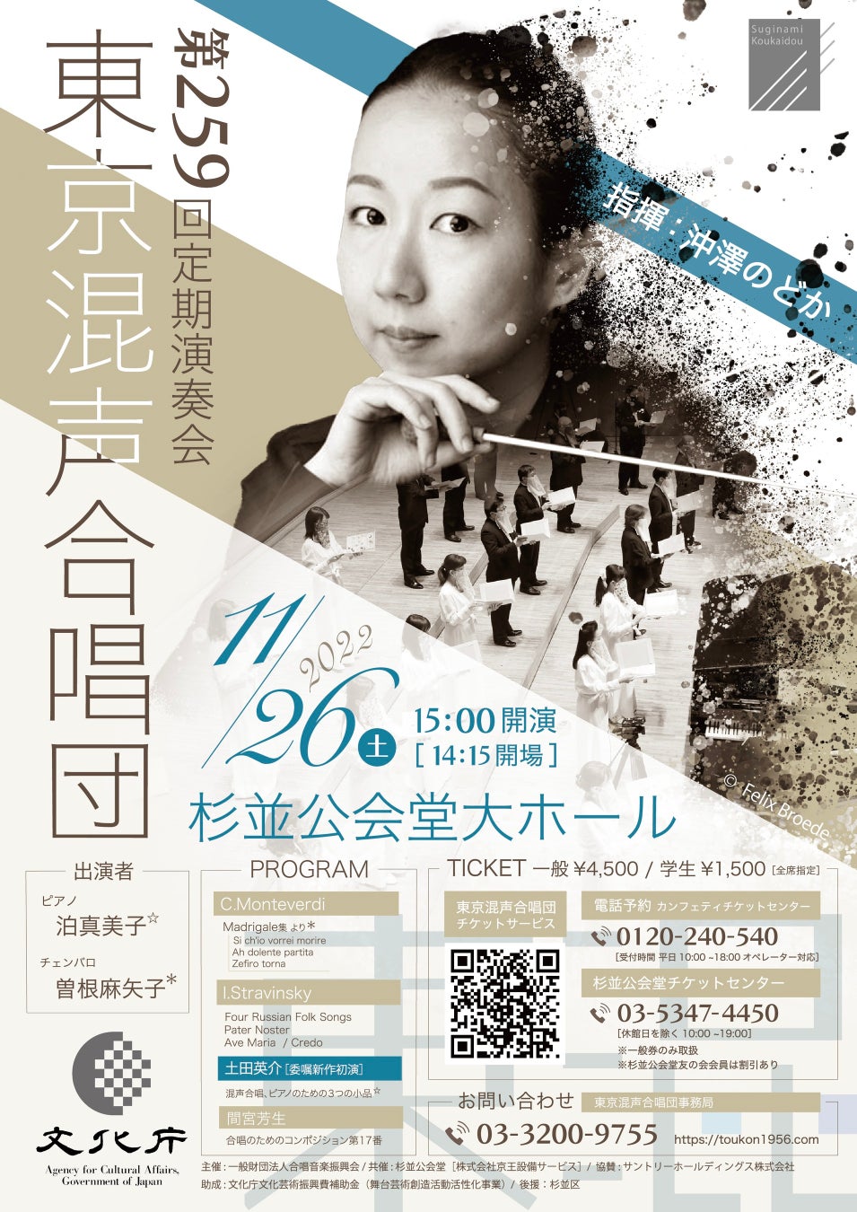 一般財団法人合唱音楽振興会主催、『東京混声合唱団 第259回定期演奏会』が2022年11月26日 (土)に杉並公会堂 大ホール(東京都杉並区上荻1-23-15)にて開催されます。