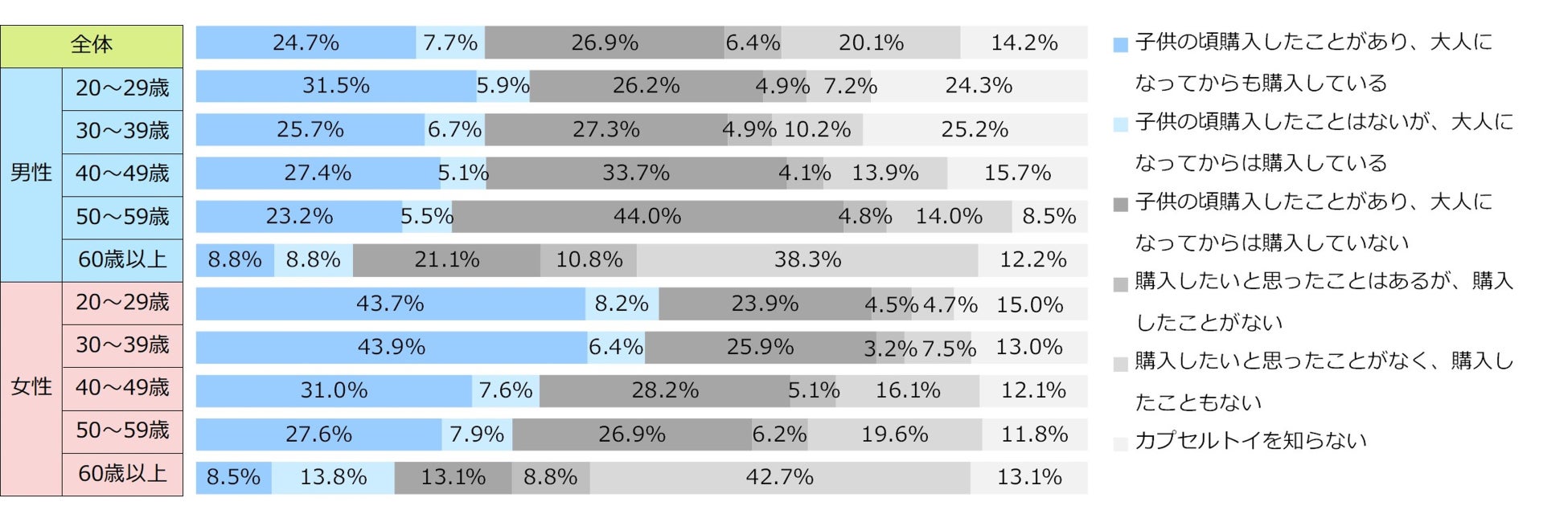 当社が2022年12月に実施したインターネットアンケート調査では、20代・30代女性の2人に1人が、大人になってからカプセルトイを購入したことがある、ということが明らかになりました。男性も含めた全年齢平均でも、購入経験者は3割を超えており、カプセルトイの大人人気の高さが裏付けられました。