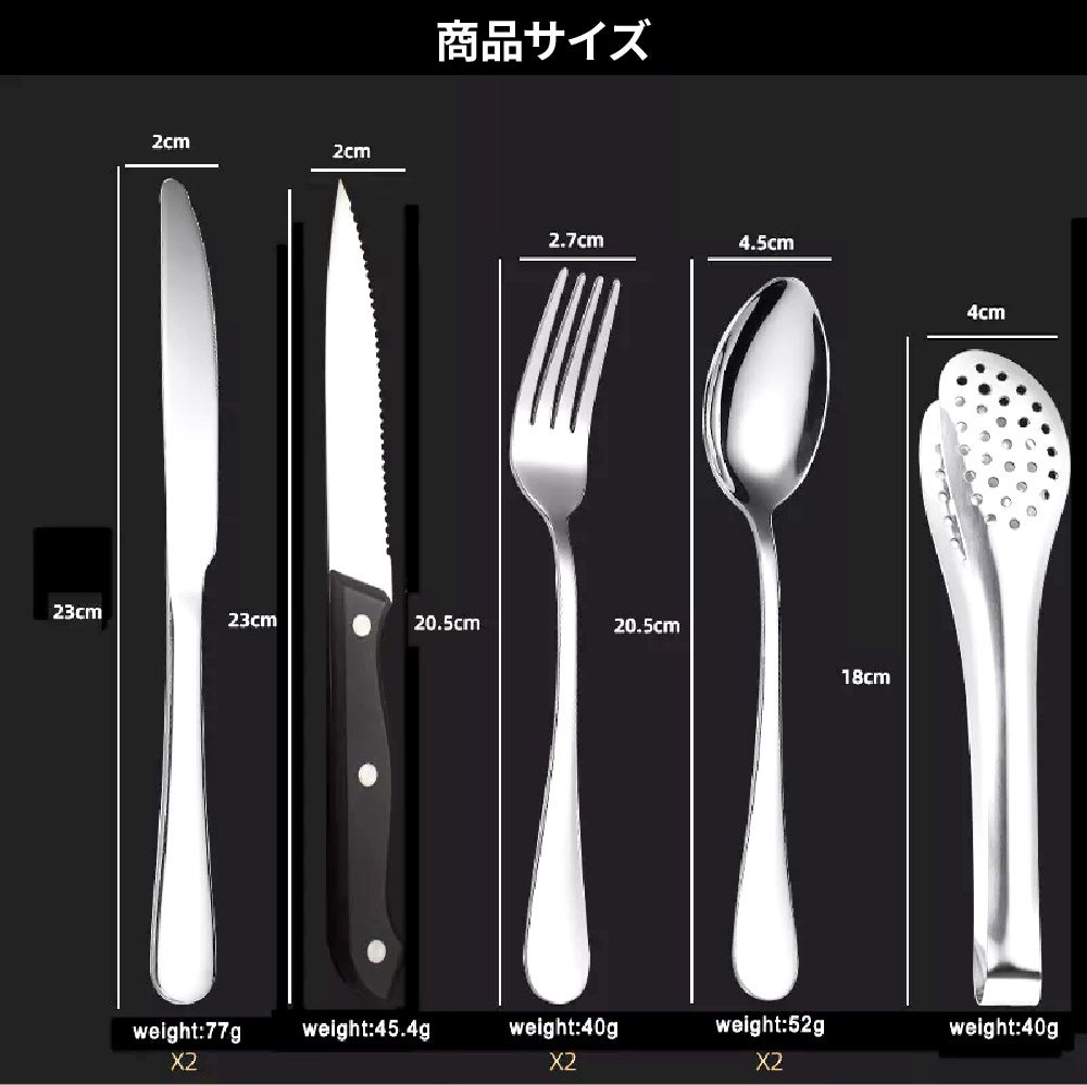 | セット内容 | ステーキナイフx1+ディナーナイフx2+フォークx2+スプーンx2+トングx1+皿x2 ※ステーキナイフとトングを除いて、各食器が2名分含まれています。 |