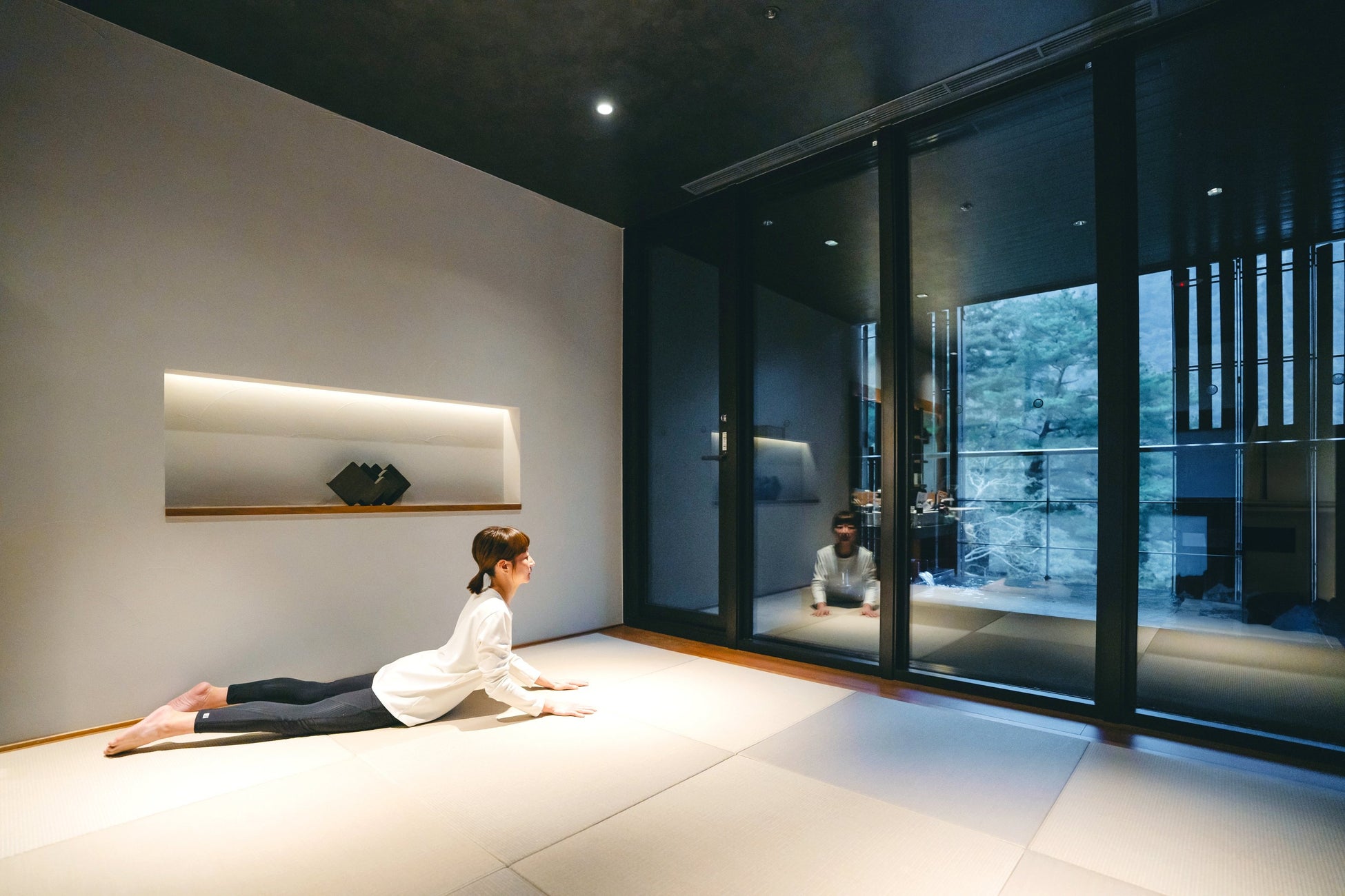 月見の客室の畳の空間で、深呼吸に合わせたストレッチ「温泉伸呼吸」をスタッフがレクチャーします 。腹式呼吸を取り入れたこのストレッチは、お風呂の中で行うことを目的としたストレッチで、ゲストはご自身で温泉に入る際にも、行うことができます。温泉に入りながら行うことで、水の浮力を感じながら、呼吸を整え、筋肉をリラックスさせ、体をほぐします 。さらに炭酸水素塩泉(*3)の温泉は、肌を潤す美肌の湯とも呼ばれており、秋の乾燥対策にもつながります 。