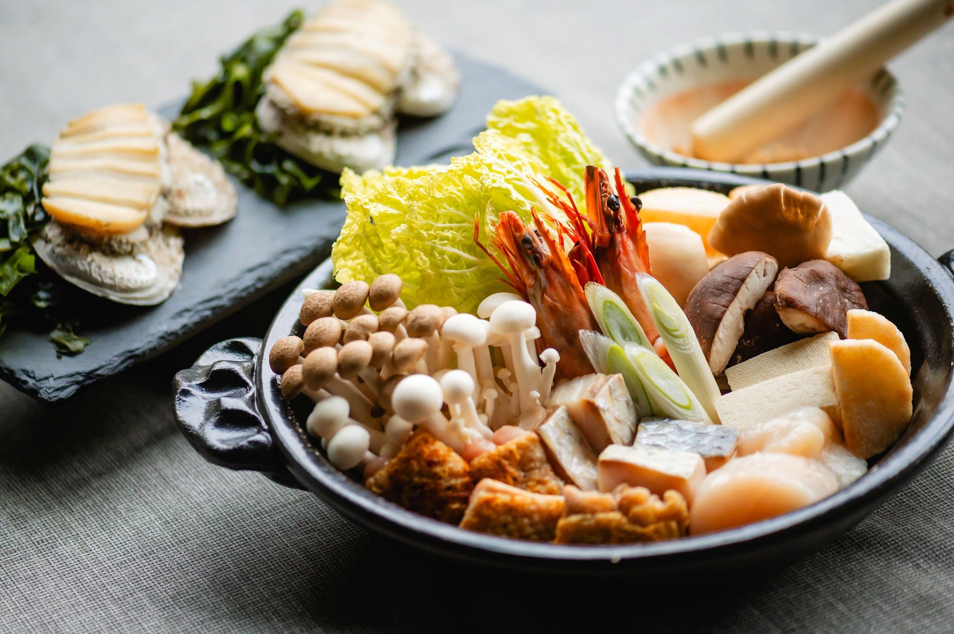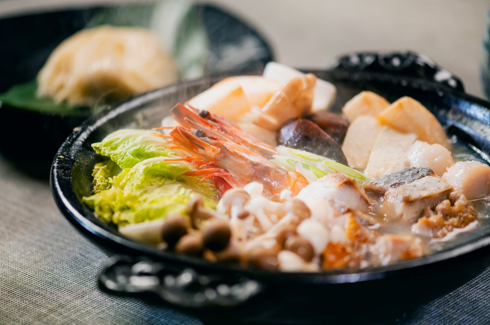 本プランでは、五行の「金」の象徴の色である白い食材を使った養生鍋を用意します 。大根や蓮根などの白い根菜と、鶏肉、エビ、ホタテなどの高タンパクな白い食材を組み合わせました 。松の実と白ごまのタレなど、調味料も白にこだわり、肺を潤し養う食事を提供します。