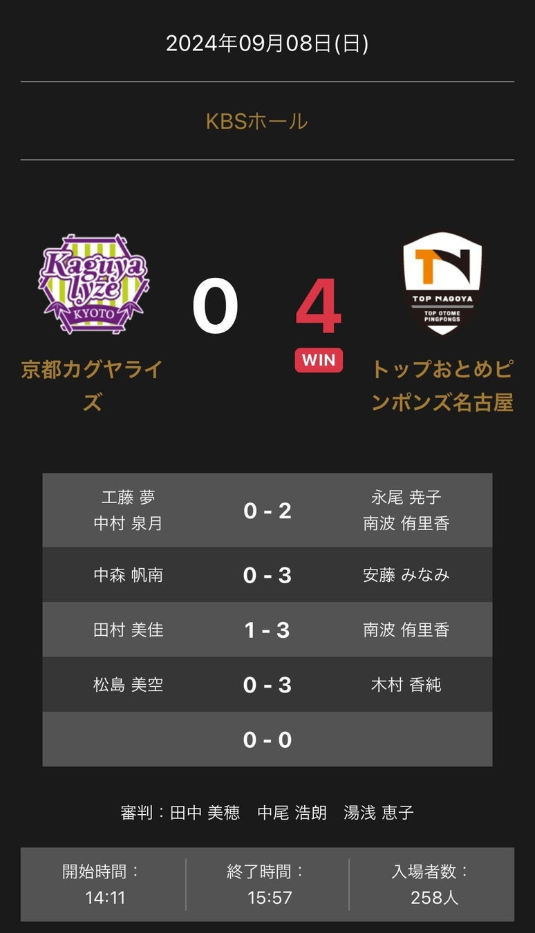 京都カグヤライズとトップおとめピンポンズ名古屋の試合は、4-0でトップおとめピンポンズ名古屋が勝利しました。