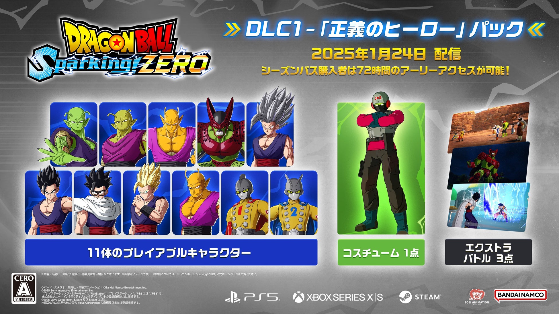株式会社バンダイナムコエンターテインメントは、 PlayStation®5/Xbox Series X|S/STEAM®にて好評発売中の 「ドラゴンボール Sparking! ZERO」につきまして、 『DLC1「正義のヒーロー」パック トレーラー』を公開し、映画「ドラゴンボール超 スーパーヒーロー」のコンテンツが収録されたDLC1として、「正義のヒーロー」パックを、1月24日(金) に配信開始することを発表いたしました。