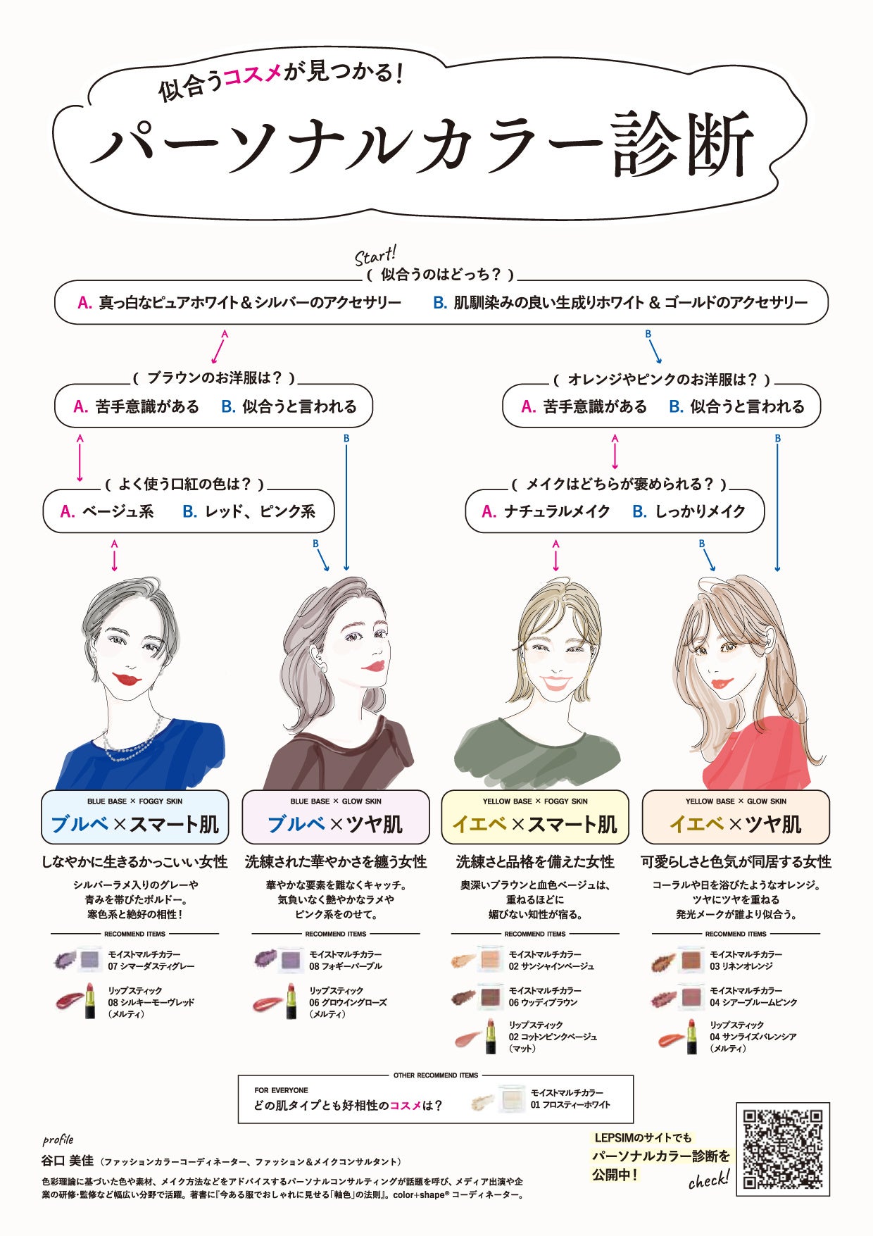 今回の診断では谷口美佳さん監修のトップス2型に加えて、LEPSIMから誕生したコスメブランド「SEN AMU(センアム)」の人気アイテムである、リップスティックとモイストマルチカラーも4タイプに似合う色味を知ることができるチャートを一緒にご用意しました。ファッションだけでなく、メイクでもより魅力的な自分になるためのお手伝いとして、パーソナルカラー診断のタイプに合うセンアムのコスメをご提案します。これらのパーソナルカラー診断コンテンツはLEPSIMの公式WEBストア .stや各店舗のPOPでもご覧いただけます。