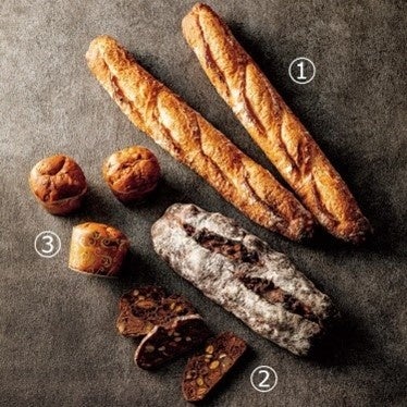 〈シニフィアン シニフィエ〉①40時間発酵バゲット(1本) 700円、②パン オ ヴァン(1本) 4,600円、③ミニパネトーネ(3個) 2,400円