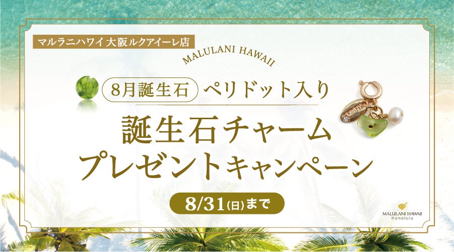 ハワイ発祥の天然石アクセサリーブランド「マルラニハワイ」大阪ルクアイーレ店では、8月にお誕生日を迎えられる方で税込11,000円以上ご購入いただいたお客様へ、誕生石を使用した特別なノベルティチャームのプレゼントキャンペーンを実施いたします。