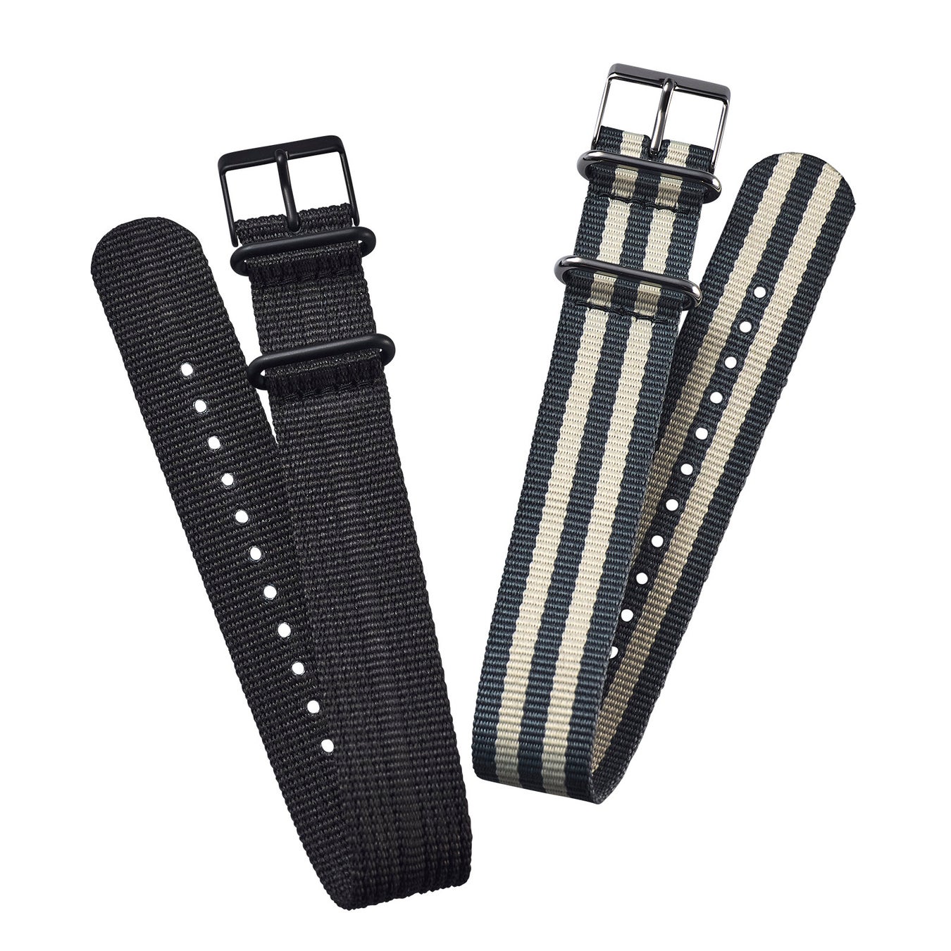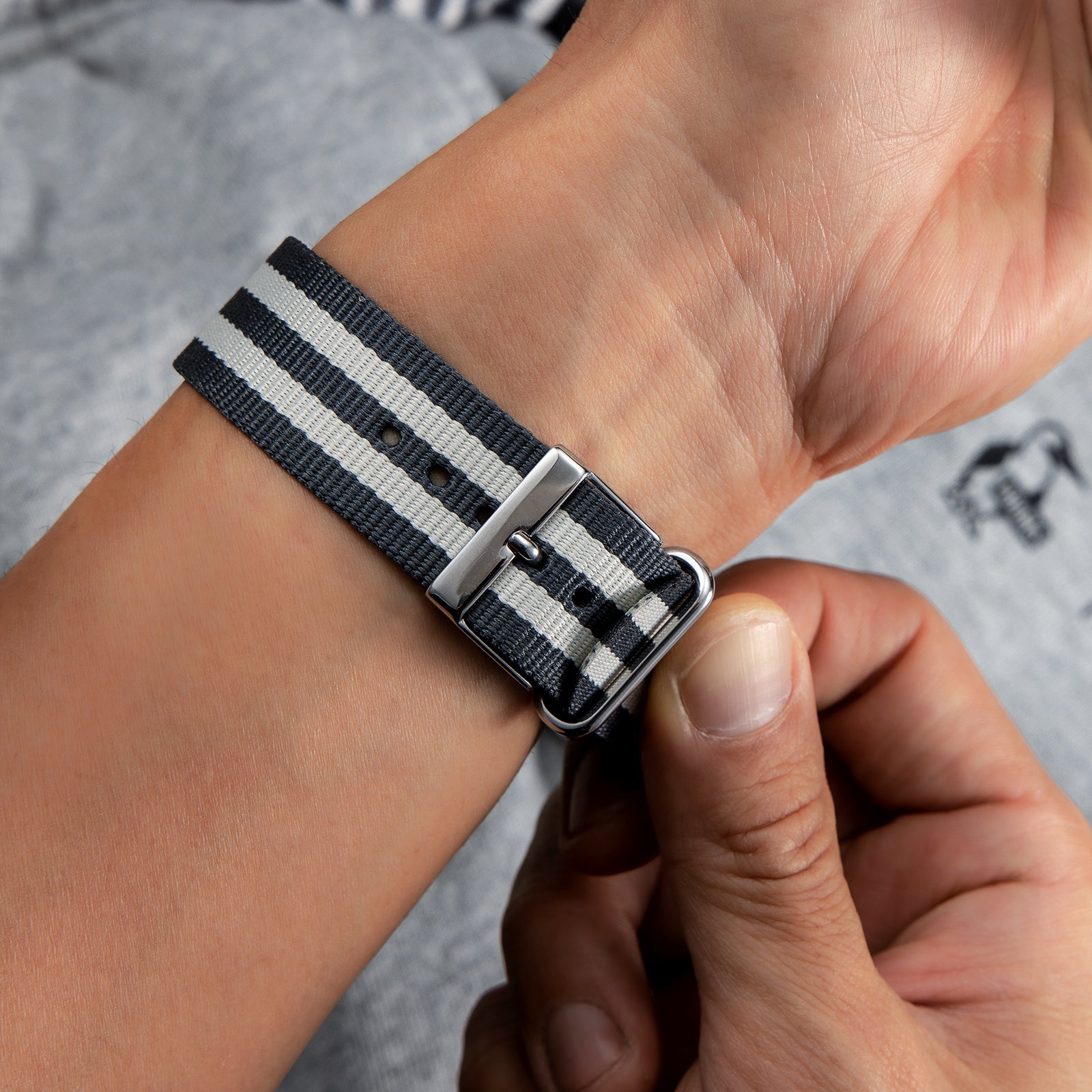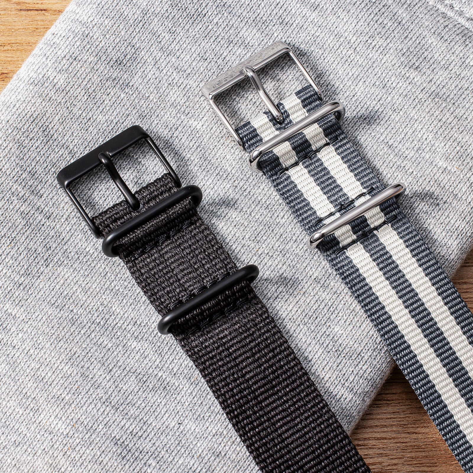 腕時計ストラップはシンプルなブラック単色のほか、専用ポーチのアジャスターのカラーに合わせたGray/Whiteの特注ストライプの替えストラップ1本が付属。ナイロン製の引き通しタイプのため好みやシチュエーションに合わせて気軽に付け替えて楽しむことができます。