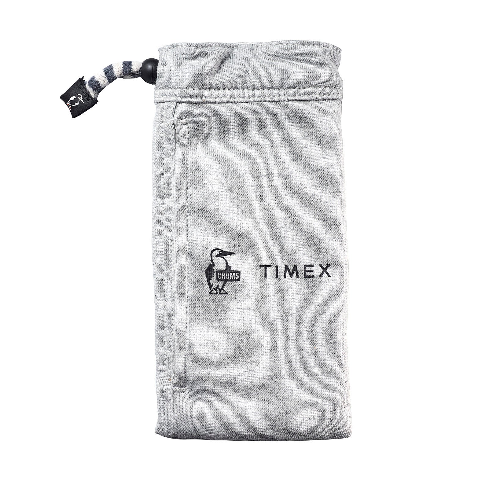 付属品として同じく1980年代に誕生したスウェットショーツ「Hurricane Walkers」のデザインソースを時計ポーチに落とし込んだ今回のコラボレーション限定時計ポーチ付き。CHUMS起源の“リテイナー”をモチーフにしたアジャスターが巾着仕様にCHUMSとTIMEXのロゴをプリントしたスペシャル時計ポーチです。
