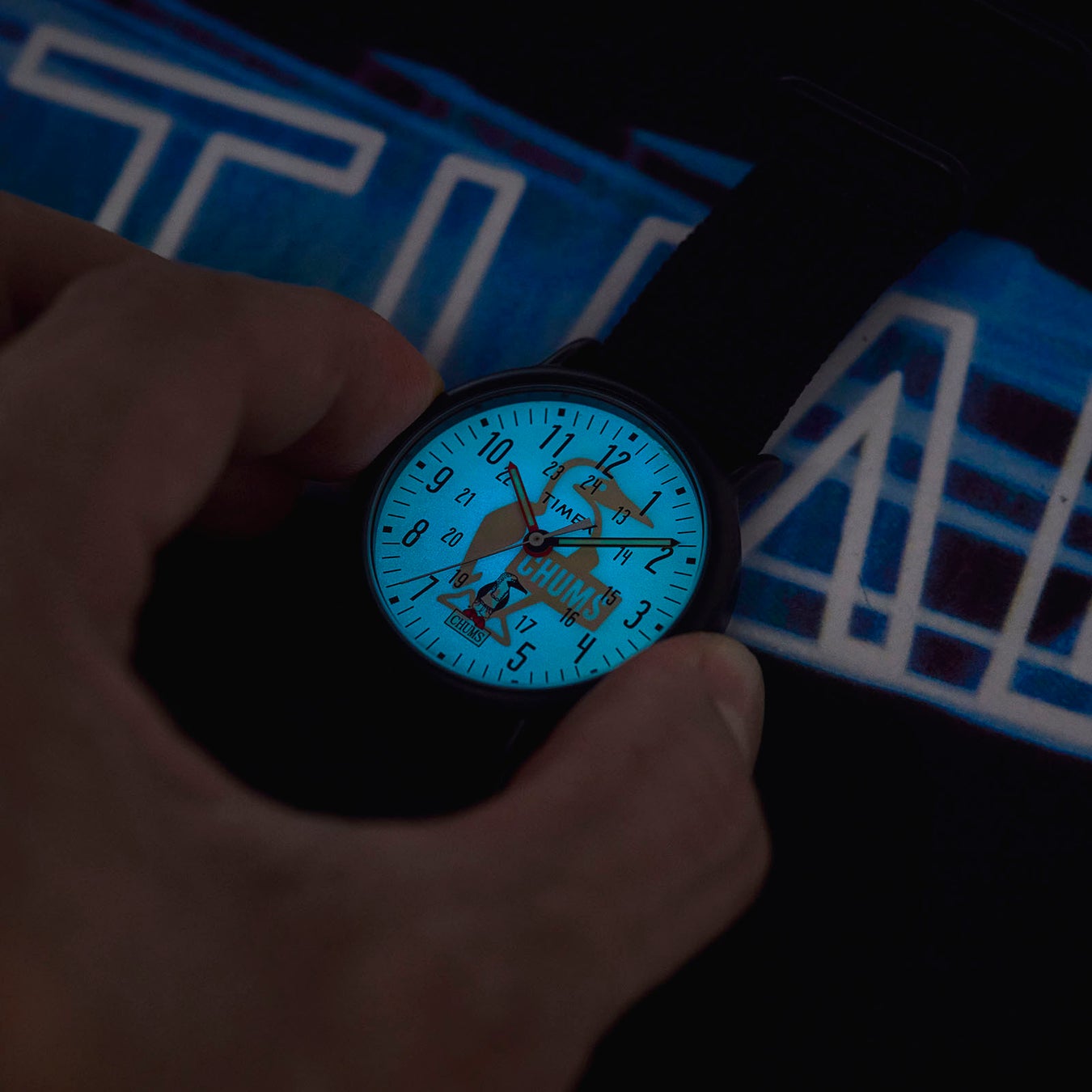 ステンレススチール製の裏蓋はCHUMSとTIMEXのロゴが刻印されたデザイン。更にリューズを押すと文字盤全面が光るインディグロライトを点けると現在のブービーロゴのシルエットが浮かび上がる、今回のコラボレーションだけのスペシャルなギミックも搭載!!