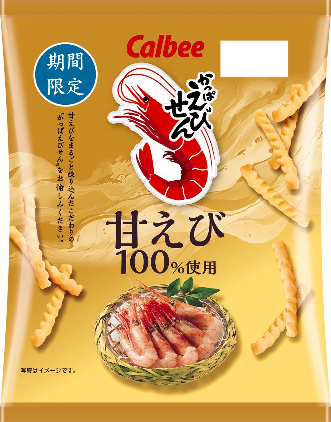 2020年12月に初めて発売し、2021年9月からは「かっぱえびせん」の中でも、撰りすぐりのえびを使用した、素材を楽しむこだわりの「えび撰」シリーズとして展開。発売以来、甘えびならではの素材の味わいを楽しめるよう追求してまいりました。昨年はお客様から「甘えびの香りがあって、やめられない、とまらない♪」「えびの旨みと甘みの味わいがたっぷりで大変おいしい」(一部抜粋)などのお声をいただきました。今年の『かっぱえびせん 甘えび』は評価いただいている中身はそのままに、パッケージを改良。上質感を活かしながら甘えびの写真を中央に配置。金色をベースに、波の模様で涼しさを演出したパッケージデザインにしました。通常の「かっぱえびせん」との、食感の違いや素材の味わいを、ぜひ食べ比べていただきたい商品です。