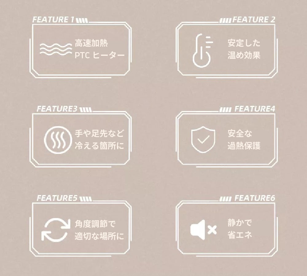 - 起動して3秒で温め効果、角度調節でピンポイントで使えて、静かで省エネ仕様