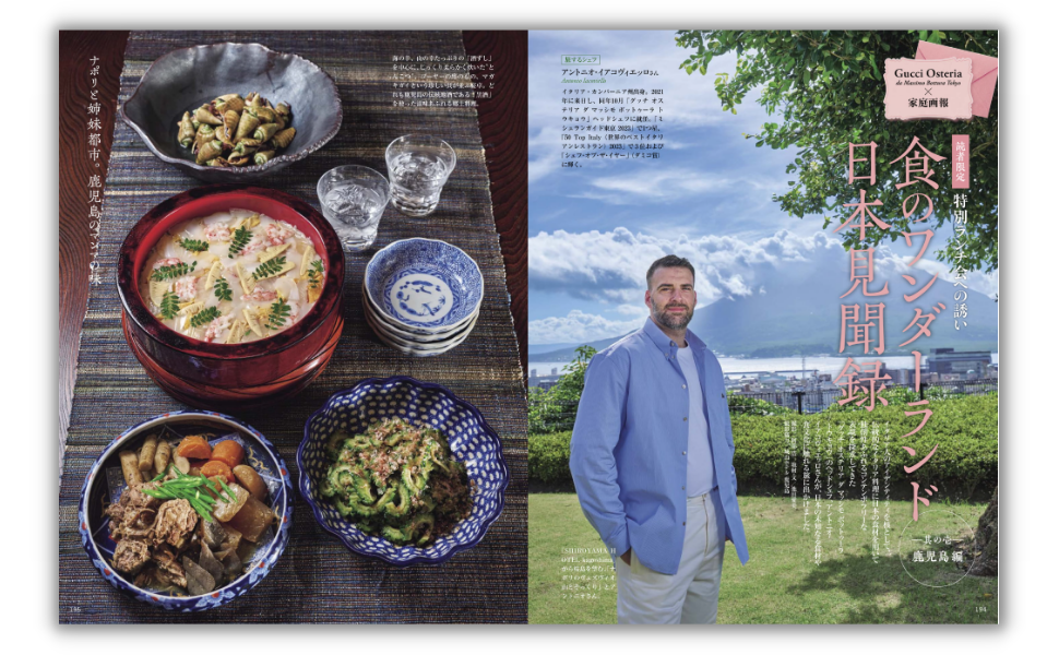 イタリア人のアイデンティティを核として、伝統的なイタリア料理に日本の食材を用いて独創性あふれるコンテンポラリーな表現を探求してきた「グッチ オステリア ダ マッシモ ボットゥーラトウキョウ」のヘッドシェフ、アントニオ・イアコヴィエッロさんが、日本の未知なる食材や食文化に触れる旅に出かけました。第1回目は、ナポリと姉妹都市でもある鹿児島県へ。さまざまな郷土料理に出合い、新たなインスピレーションを得たと語るアントニオさん。この鹿児島の取材から生まれた料理を『家庭画報』読者の皆様とシェアする、特別ランチ会を開催します。ご参加方法・詳細は誌面にて。