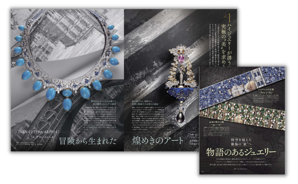 単なる装飾品の域を超え、感動と驚きを与えてくれるジュエリーの大特集。メゾン伝統のスタイル、サヴォアフェールに革新的なテクノロジーを駆使して生まれたさまざまな新作は、歴史を遡り、遥か彼方の風景や夢想の世界にまで私たちを連れていってくれます。数々の逸品を、美しい写真とともにご堪能ください。「グランドツアーがもたらす、想像力」(佐藤直樹・東京藝術大学教授)なども掲載。