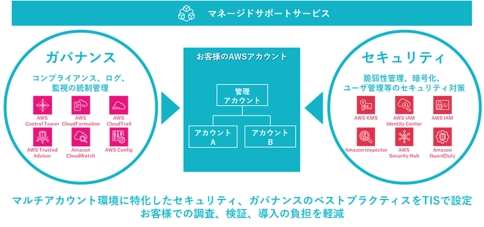 AWS請求代行やセキュリティ対策、アカウント作成・移管作業、各種サポート利用、申請の代行などを備えたマネージドサービスです。AWSの運用に関する一般的な情報に加え、TISが大規模AWS開発・運用案件で得たベストプラクティスに基づいてサポートします。