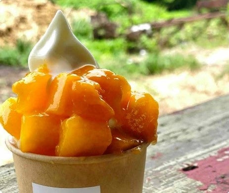 新富町で50年以上酪農を営む「松浦牧場」の牛乳“まつうらみるく”は、低温殺菌製法で、なめらかな口当たりとさっぱりとした甘い後味が特徴。2020年から3年連続で生乳品質共励会優秀賞を受賞しています。その“まつうらみるく”を使ったソフトクリームに、宮崎の完熟マンゴーをたっぷりトッピングし、さらに完熟マンゴーの濃厚ソースをかけて仕上げました。