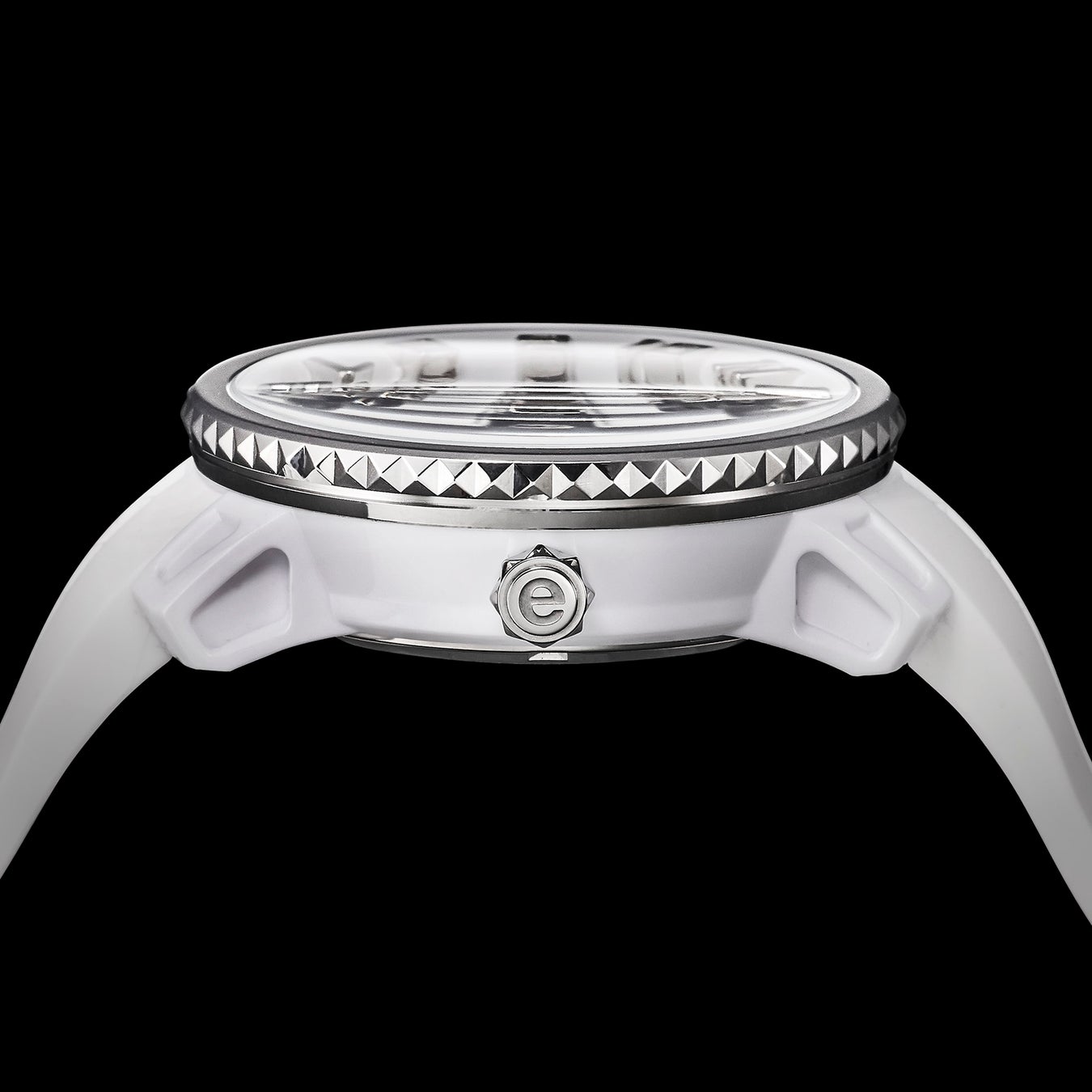 アートが描かれたダイヤルには、ホワイトを採用。3Dインデックスや針には、ミラーのようなポリッシュ加工を施し、この作品が重要性を訴える「自分」を意識できるよう仕上げました。
