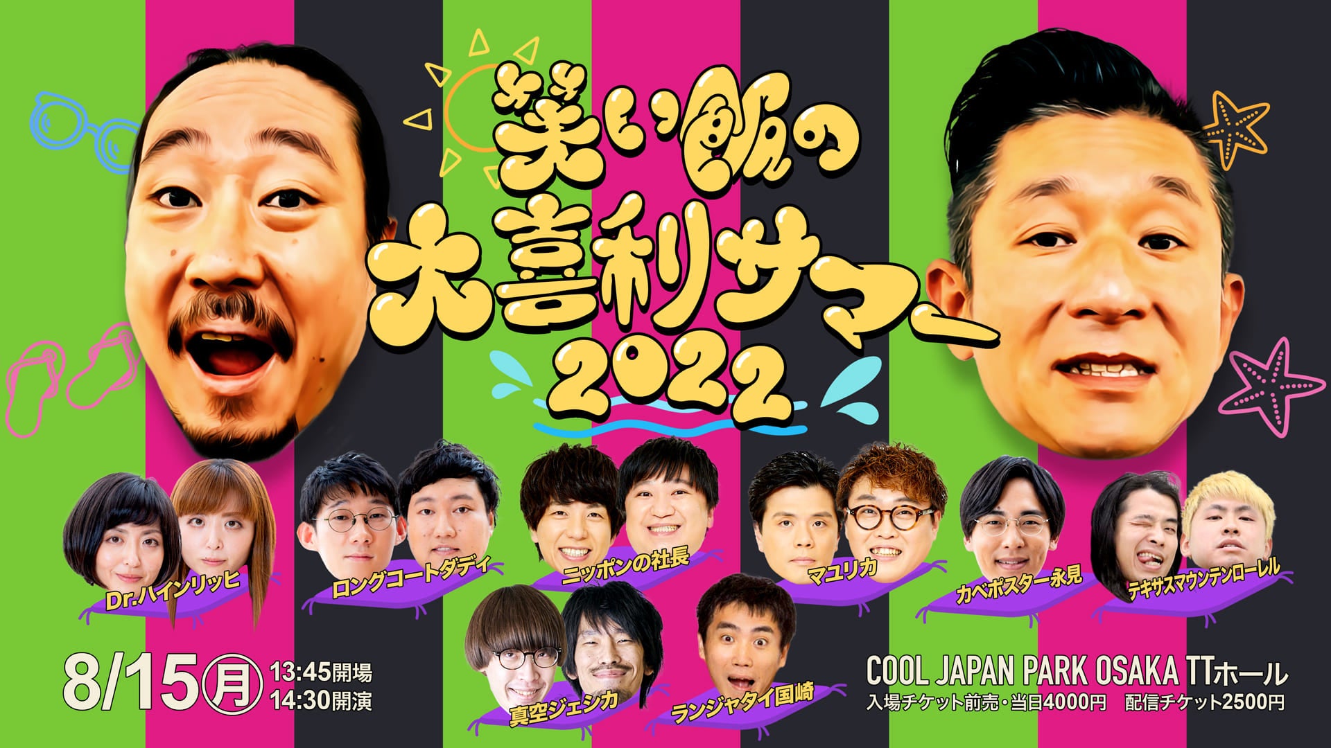 この度、人気者から旬の若手まで、様々なラインナップでお届けするお笑いフェスティバル「真夏のラフフェス」を、2022年8月6日(土)~8月15日(月)に大阪・COOL JAPAN PARK OSAKA(TTホール、WWホール)にて「真夏のラフフェスin森ノ宮2022」として、2022年8月2日(火)~8月5日(金)に東京・草月ホールにて「真夏のラフフェスin赤坂2022」として初の“東西開催”をすることが決定いたしました。