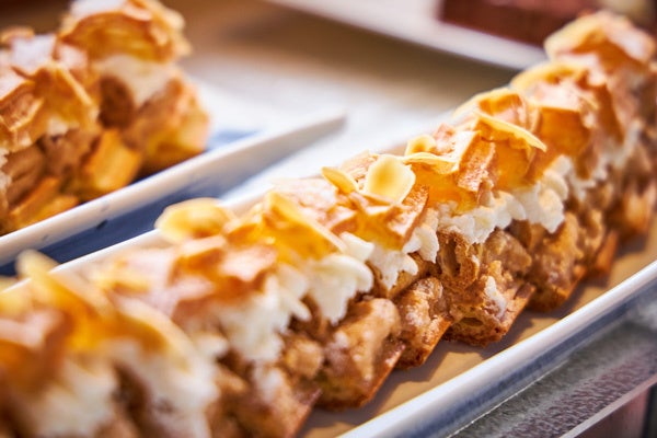 食後のデザートは、鉄板で仕上げる旬香自慢のふわふわな出来立てパンケーキをお席にご用意いたします。また、小菓子、ゼリー、焼き菓子などのパティシエ特製デザートも6種類ビュッフェ台に並びます。食べやすいサイズでお好きなだけお取りいただけますので、心ゆくまでご堪能ください。