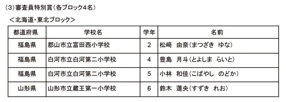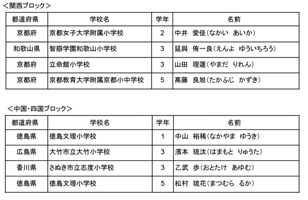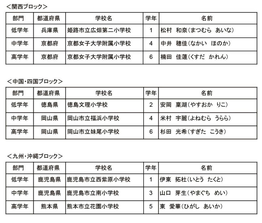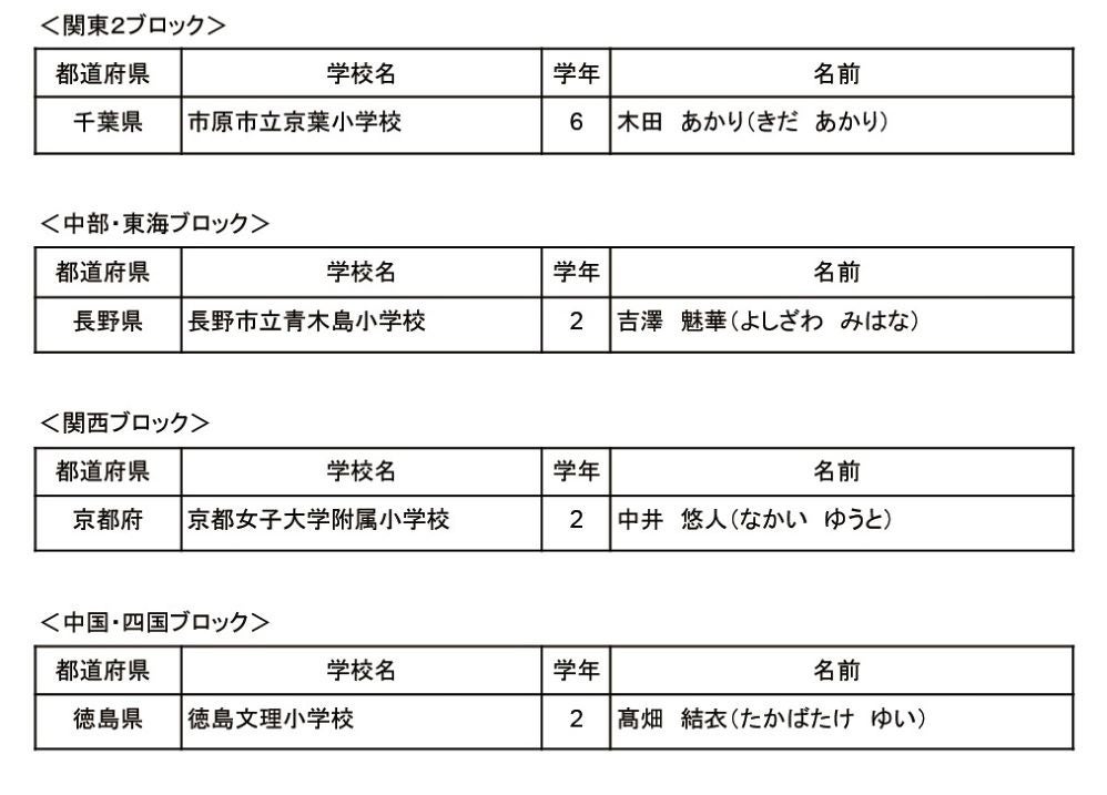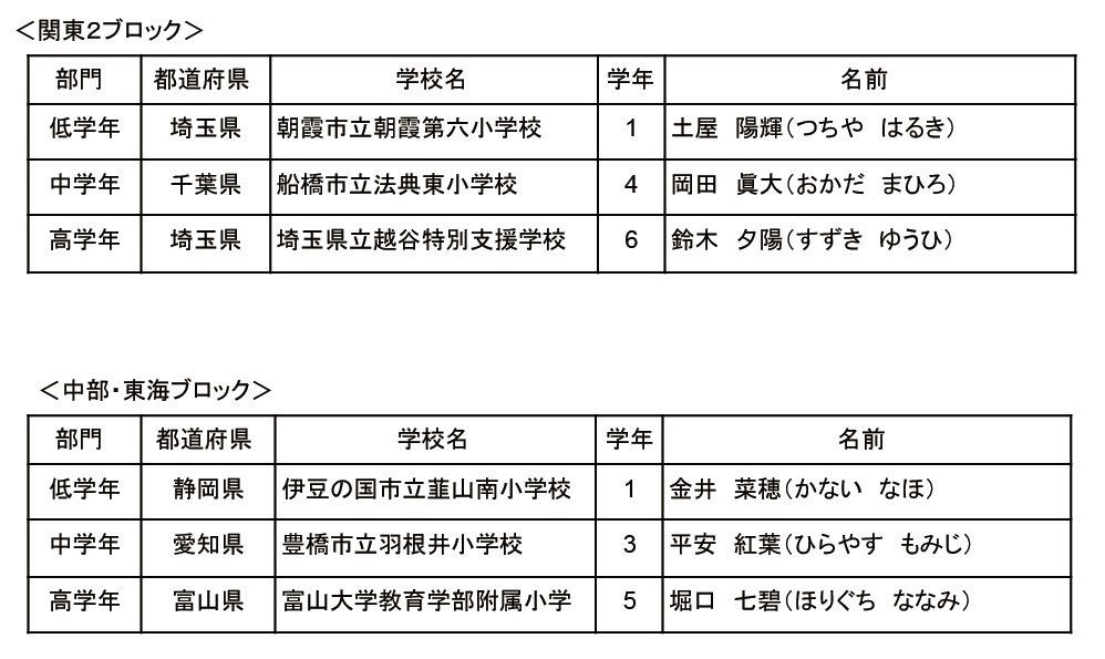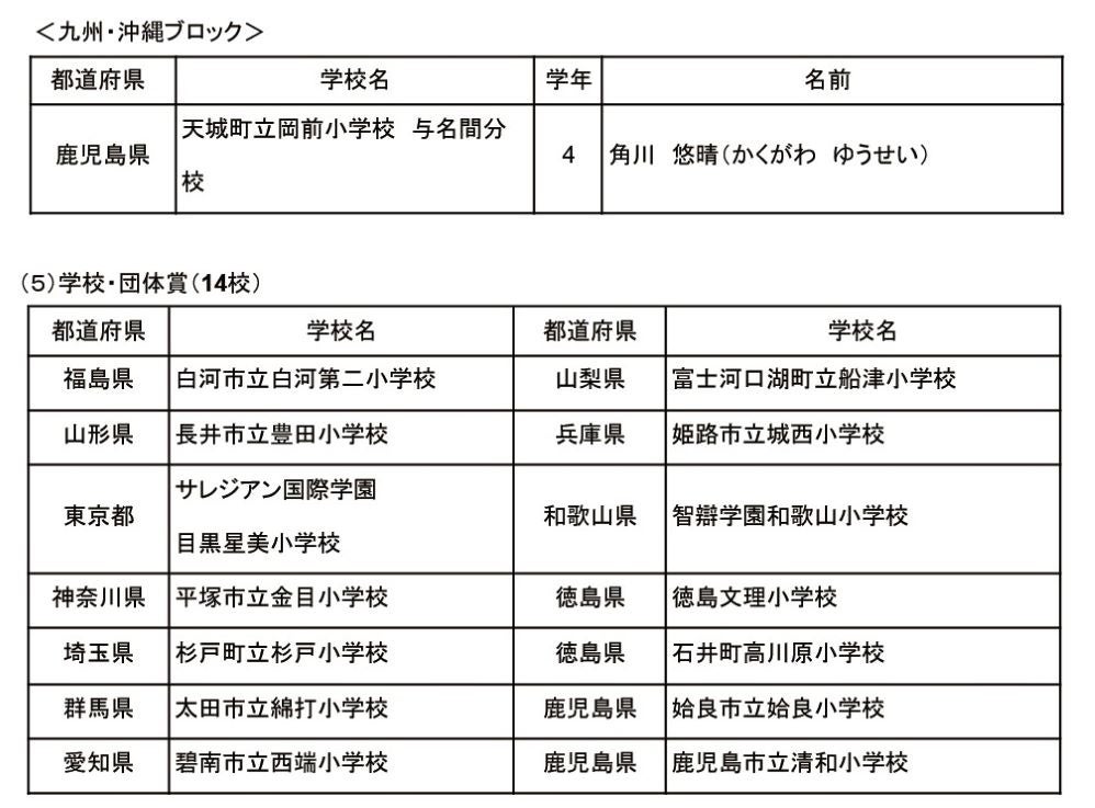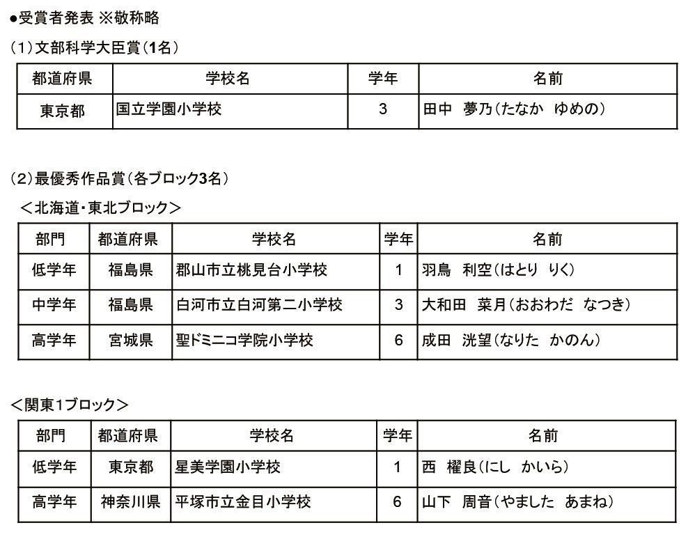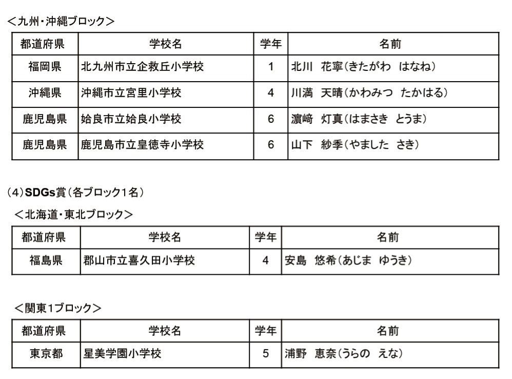 なお、受賞作品・団体は、全国を7ブロック(北海道・東北、関東1<東京都・神奈川県>、関東2<茨城県・栃木県・群馬県・埼玉県・千葉県>、中部・東海、関西、中国・四国、九州・沖縄)に分けて、応募作品の一次審査、二次審査を実施し、池上彰氏を審査員長とする最終審査会を通じて、「文部科学大臣賞」1作品、各ブロックの「最優秀作品賞」20作品、「審査員特別賞」28作品、「SDGs賞」7作品、各ブロックから2校・団体を選出した「学校団体賞」14校・団体を決定いたしました。