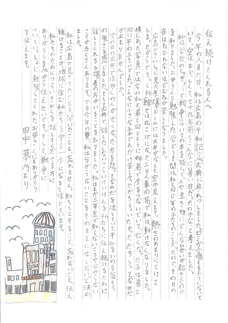 文部科学大臣賞は、各ブロックから選ばれた最優秀作品賞の中から、国立学園小学校3年生の田中夢乃さんの「伝え続けてくれる人へ」に決定しました。田中さんには文部科学大臣賞の表彰状と副賞が授与されます。