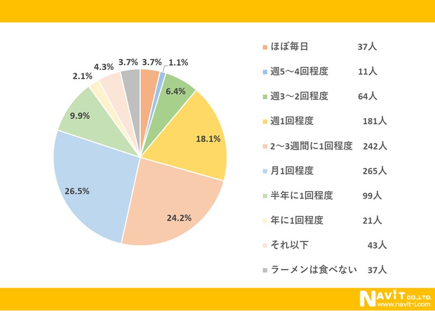 「ラーメンはどのくらいの頻度で食べますか?」という質問については、「月1回程度」が26.5%、「2~3週間に1回程度」が24.2%という結果になり、約半数の人が2週間~1か月に1回程度の頻度でラーメンを食べていることが分かりました。