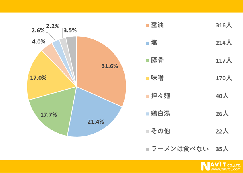 「好きなラーメンの種類は何ですか?」という質問については、「醤油」が31.6%、「塩」が21.4%、「豚骨」が17.7%という結果になり、醤油ラーメンが1番人気だということが分かりました。