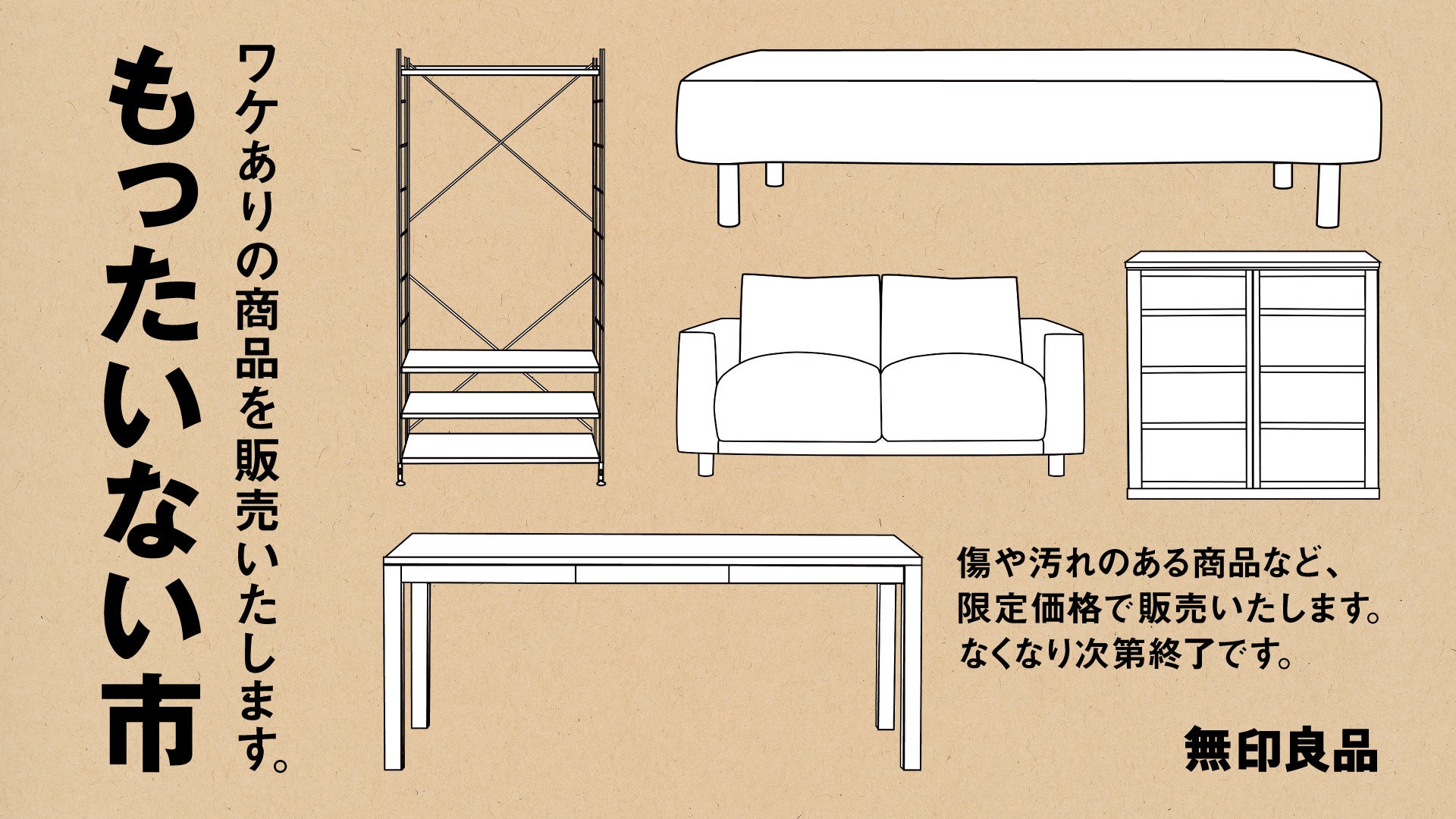 「もったいない市」は、限りある資源を無駄にするのは“もったいない”という想いから、傷・汚れ等によりお客さまへお届け出来なかった商品や、開封後返品された商品など、まだ十分使える商品を廃棄するのではなく、お買い得な価格で必要なお客さまに販売する取り組みです。店舗ごとに取り扱い商品は異なりますが、無印良品の定番家具や雑貨、靴下、子供服など、日常にすぐに役立つ商品を取り揃えています。(在庫がなくなり次第終了)