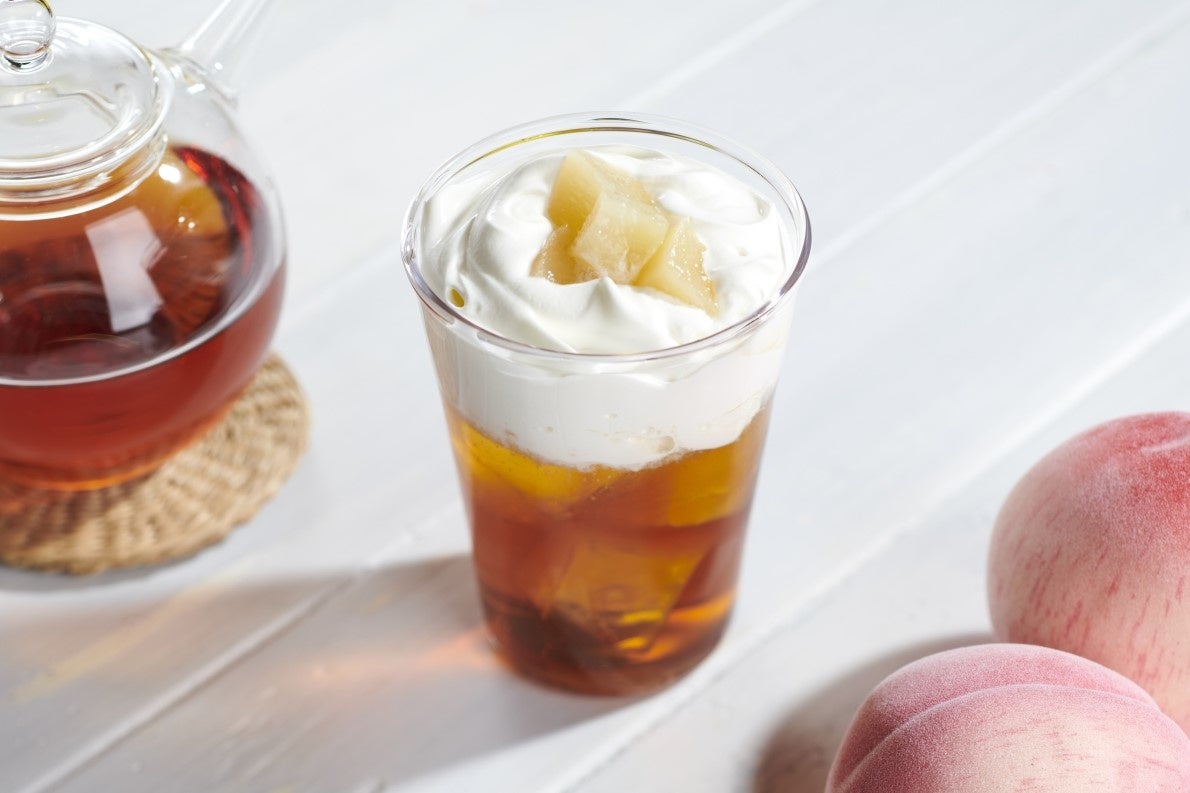 コラボメニューでは、初夏が旬である桃を中心に、フルーツをつかった3種のドリンクをご用意しました。特に、女性からの人気が高いチーズを加えた“チーズホイップピーチティー”、すっきりとした爽やかな風味がひろがる“ピーチティーソーダ”、カフェインレスでどなたでも楽しめる“フルーツインルイボスティー”をラインアップしています。