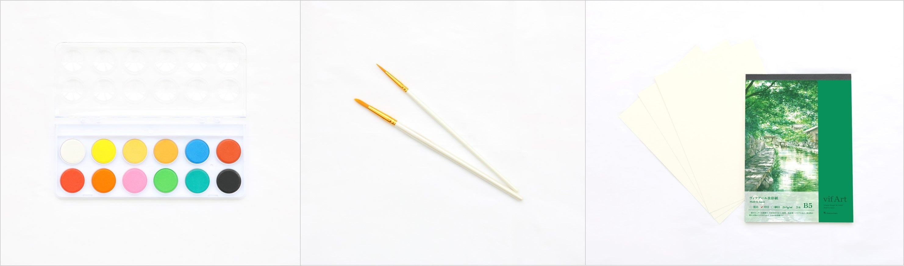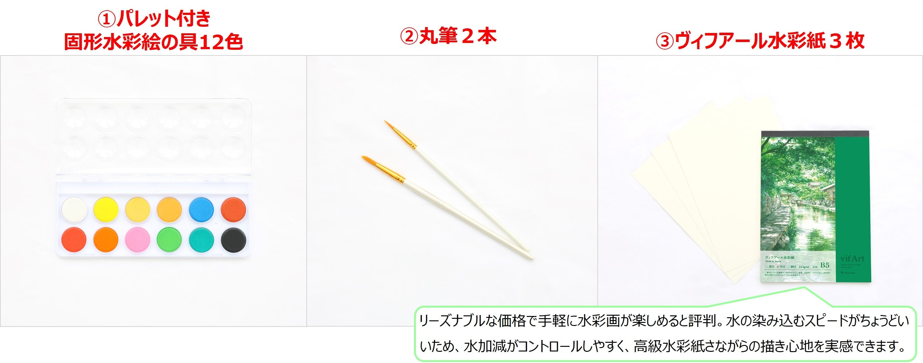 絵の具・筆・水彩紙の豪華3点セットつきですぐに始められる♪