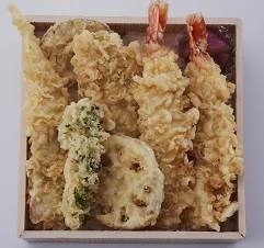 海老2本に、甘鯛、イトヨリのほか、菜の花、さつまいも、はすを盛り付けた豪華な限定天丼。