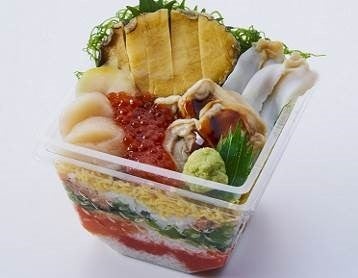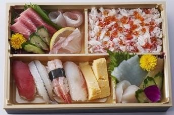 ズワイガニと北海道産イクラのちらし寿司、本マグロと旬のにぎり鮨、豊洲市場直送鮮魚のお刺身を盛り合せたお弁当。