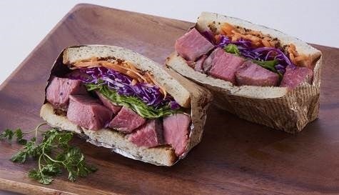 ほっぺタウン惣菜人気NO.1メニューのローストビーフパヴェをたっぷり200g使った、スペシャルなサンド。
