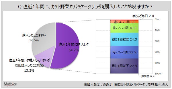 【カット野菜に関する調査】直近1年間にカット野菜・パッケージサラダを購入した人は約54%。そのうち、週1回以上購入した人は5割弱。購入意向者は約55%
