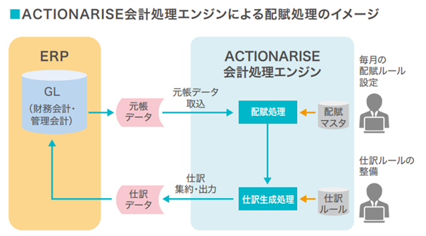 今回目標とした「会計処理エンジン」の役割は、毎月ERPから出力した会計データを蓄積し、最大の課題であった複雑な配賦処理を行った後、仕訳データを生成し、再度ERPへ連携するものです。(イメージ図参照)。