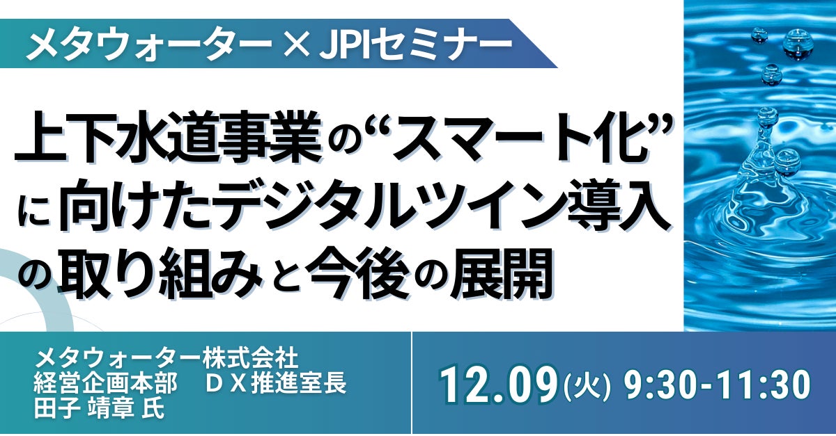 【JPIセミナー】メタウォーター(株)「上下水道事業の ”スマート化” に向けたデジタルツイン導入の取り組みと今後の展開について」12月9日(火) 開催