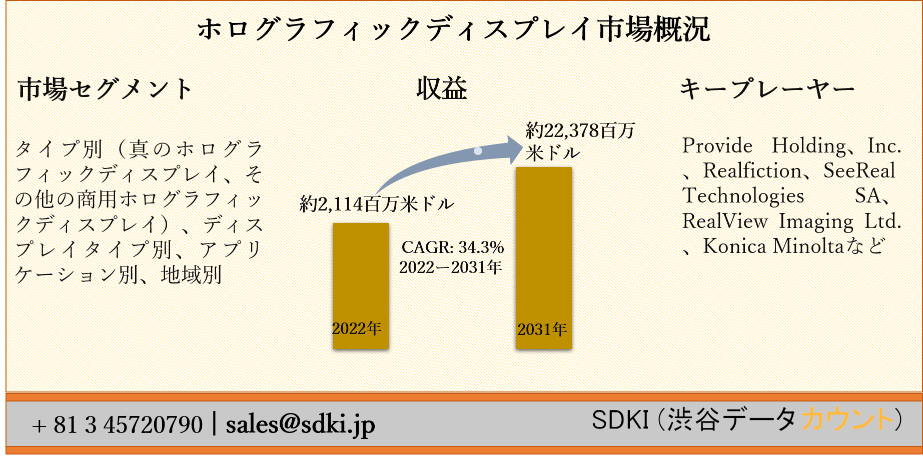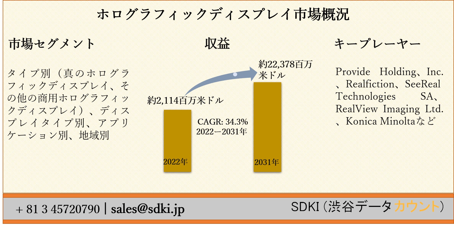 ホログラフィックディスプレイ市場は、2022年に約2,114百万米ドルの市場価値から、2031年までに約22,378百万米ドルに達すると推定され、2022-2031年の予測期間中に34.3%のCAGRで成長すると予想されています。