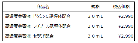今回発売する「高濃度美容液(*1)」は、保湿成分(*3)を高配合(*1)した、天然由来成分(*2)100%の美容液シリーズです。肌の悩みに応じて選べるよう、保湿成分のビタミンC誘導体、レチノール誘導体、セラミドをそれぞれ配合した3種類を品揃えしました。