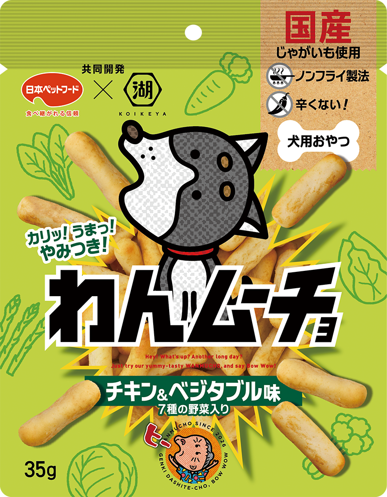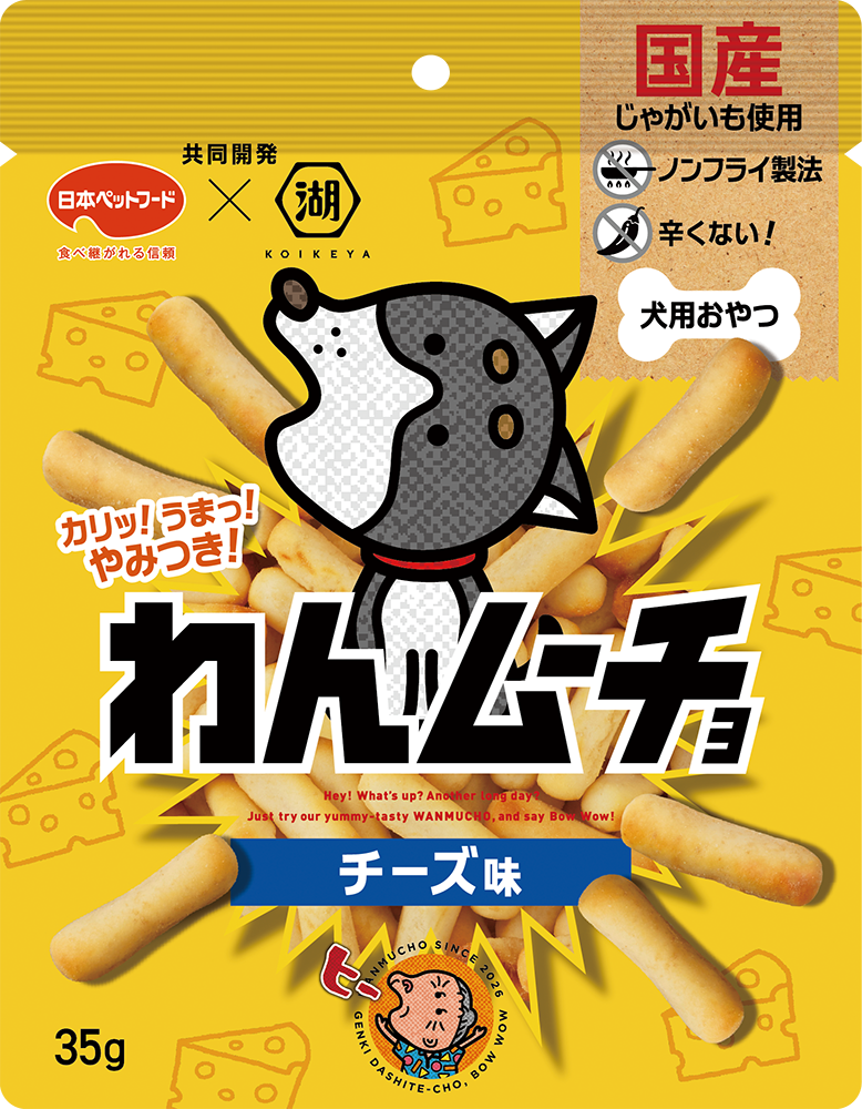株式会社湖池屋(社長:佐藤章)は、日本ペットフード株式会社(社長執行役員:片山俊次)とコラボレーションし、国産じゃがいもをノンフライ製法で仕上げた愛犬用おやつ「わんムーチョ」を、2026年3月5日(木)12時に湖池屋オンラインショップで発売します。