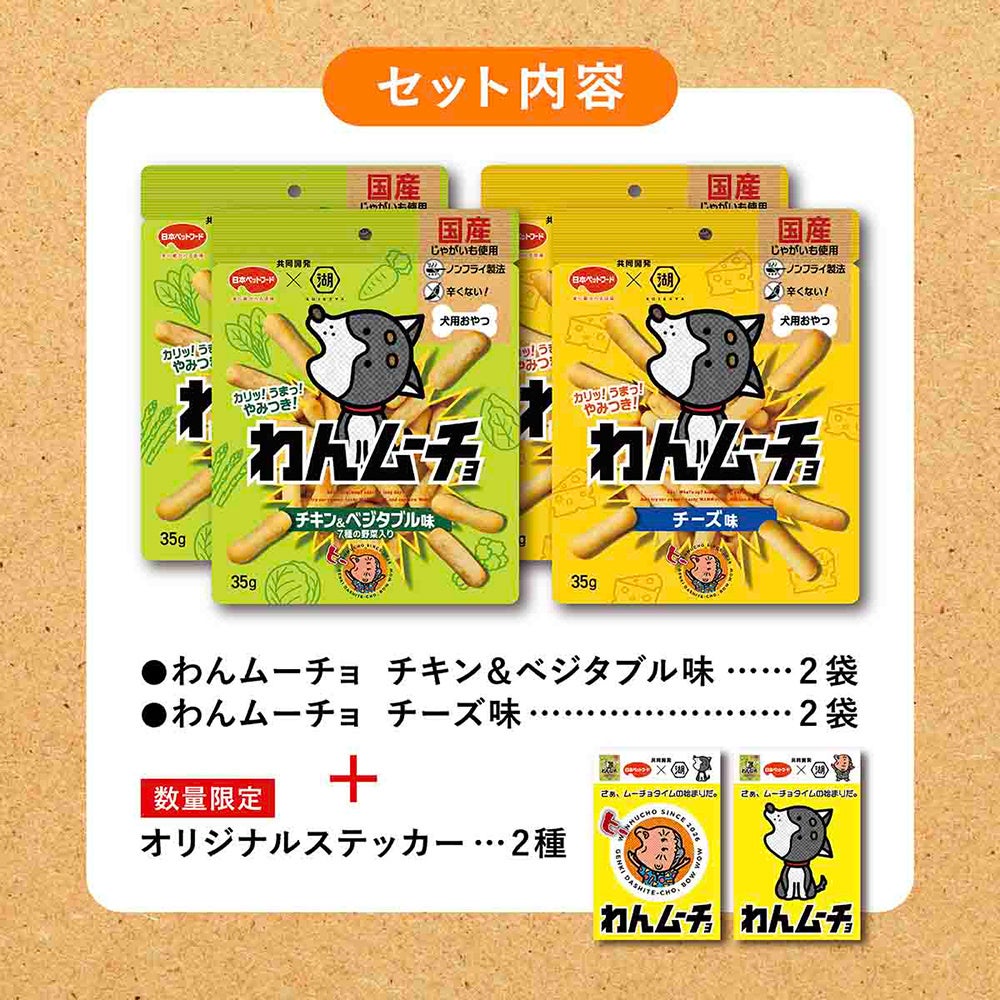 全国の小売店にて2026年3月2日(月)より順次展開を開始しますが、湖池屋オンラインショップでは「わんムーチョ 夢中セット」として、各味2袋(計4袋)をセットにして3月5日(木)12時より発売します。数量限定で、今回の主役である「ヒー犬」・カラムーチョのパッケージでおなじみの「ヒーおばあちゃん」のステッカー2種を封入しますので、手に入れたい方はお早めのご注文を!