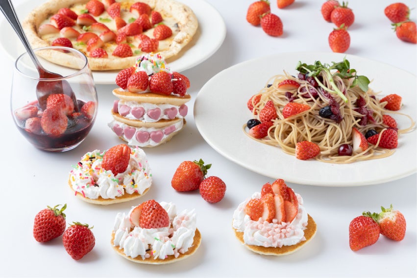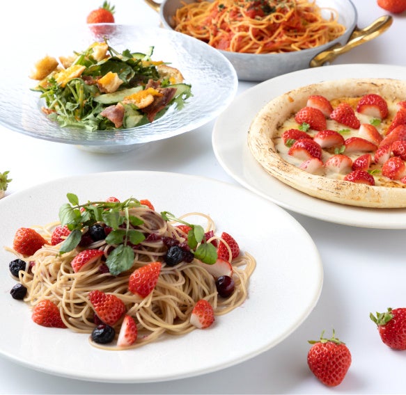 艶やかな苺を贅沢に味わうショートケーキやロールケーキを始めとした苺スイーツの数々。そして今年から新しく、苺のフルーティーさを活かしたピザやパスタなどもご用意し、お食事でも苺を存分にお楽しみいただけます。