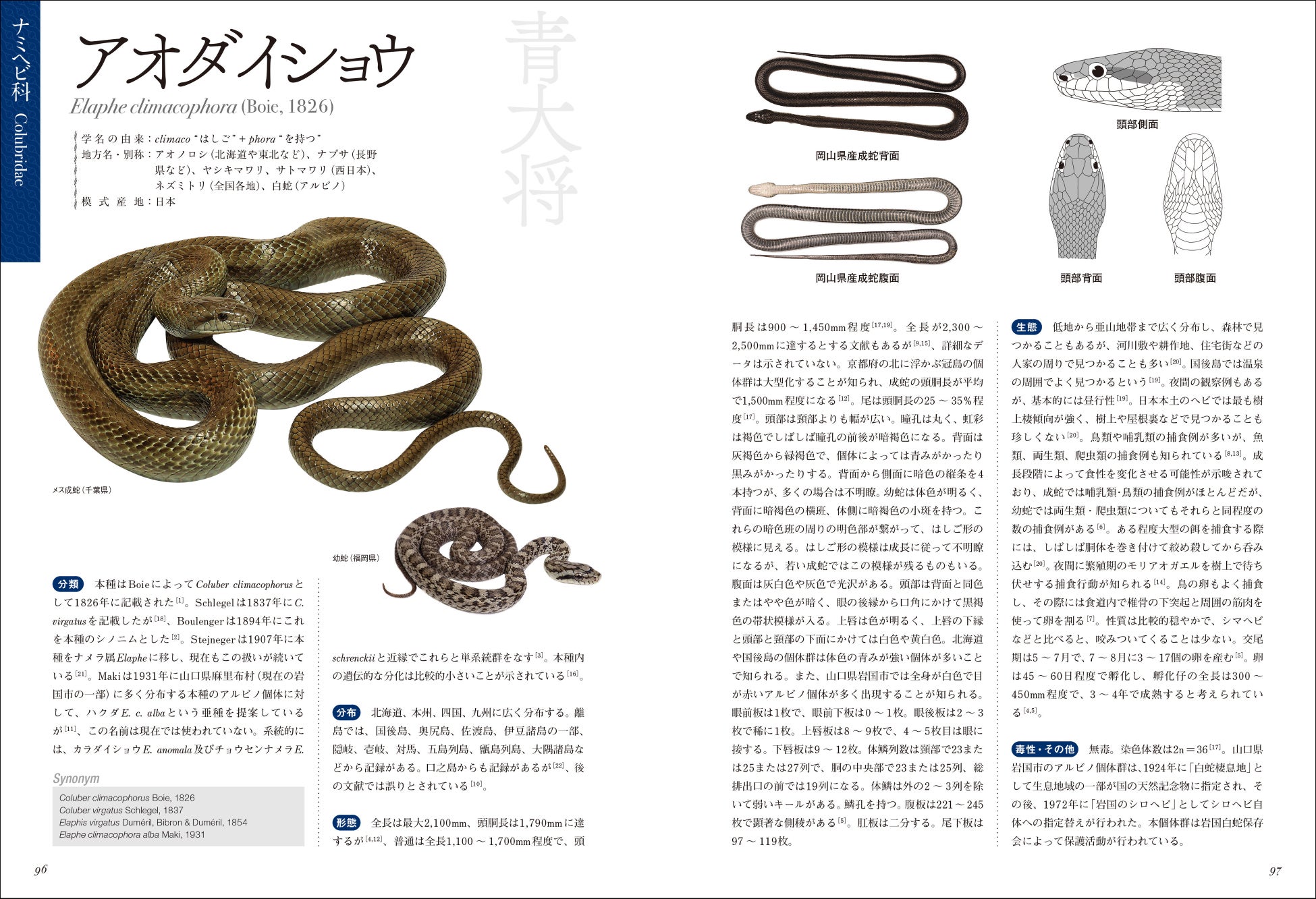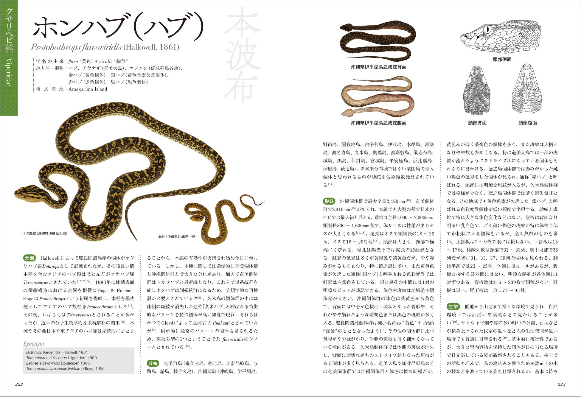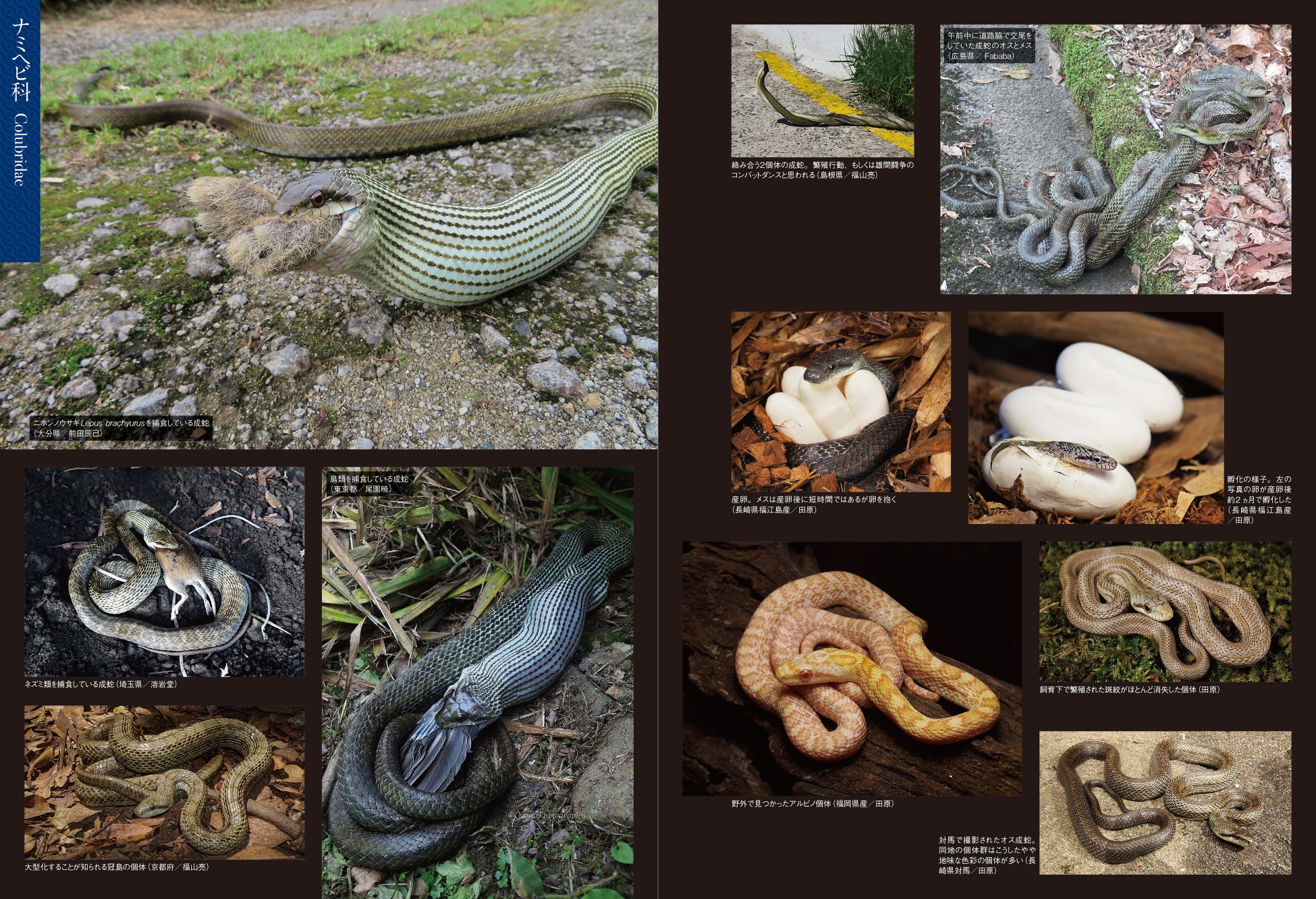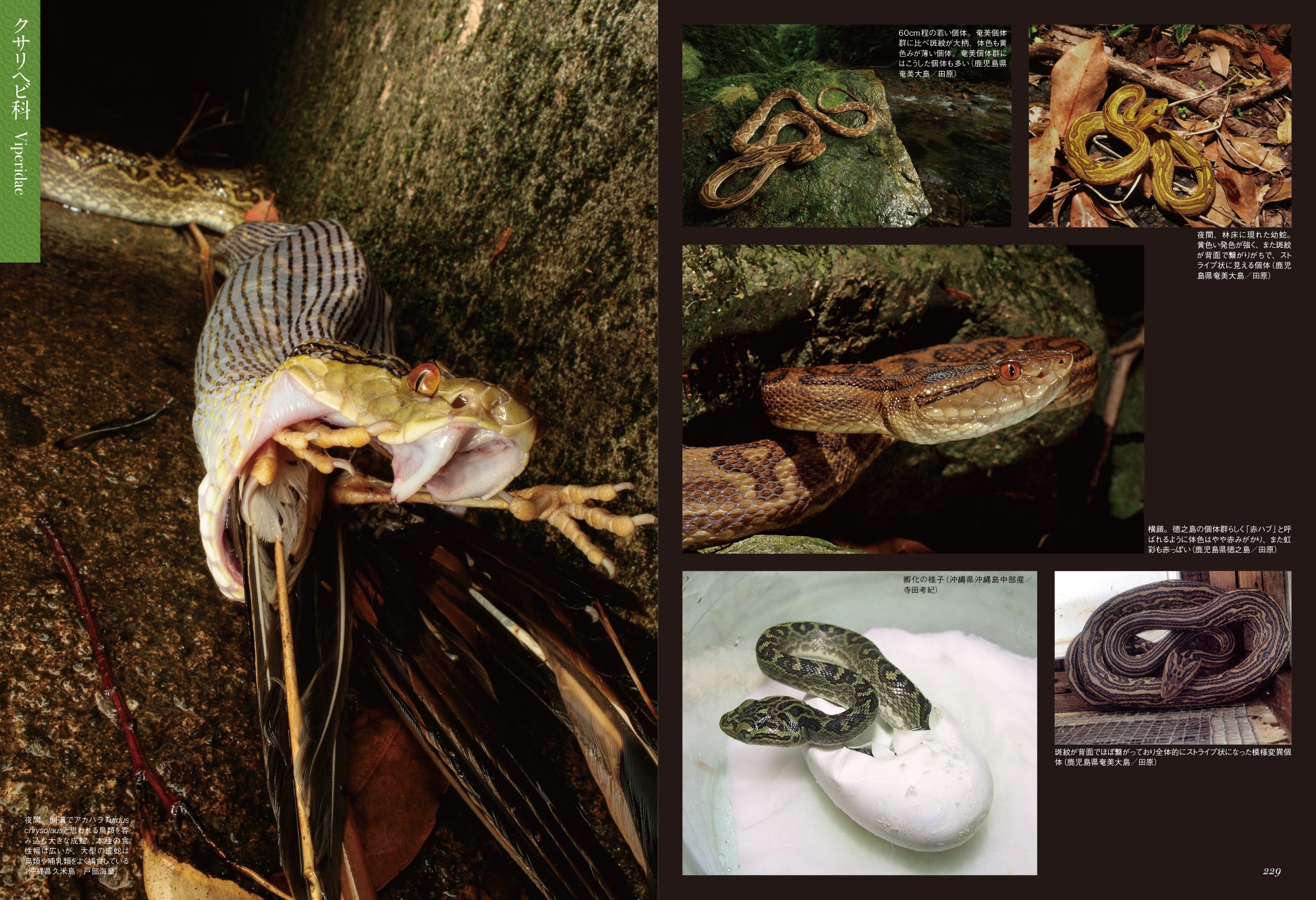 また、生体写真と、背面・腹面の標本写真、同定に役立つ頭部の体鱗を図解したイラストに加え、捕食や孵化をはじめ、貴重な生態を捉えたフィールド写真も多数掲載。