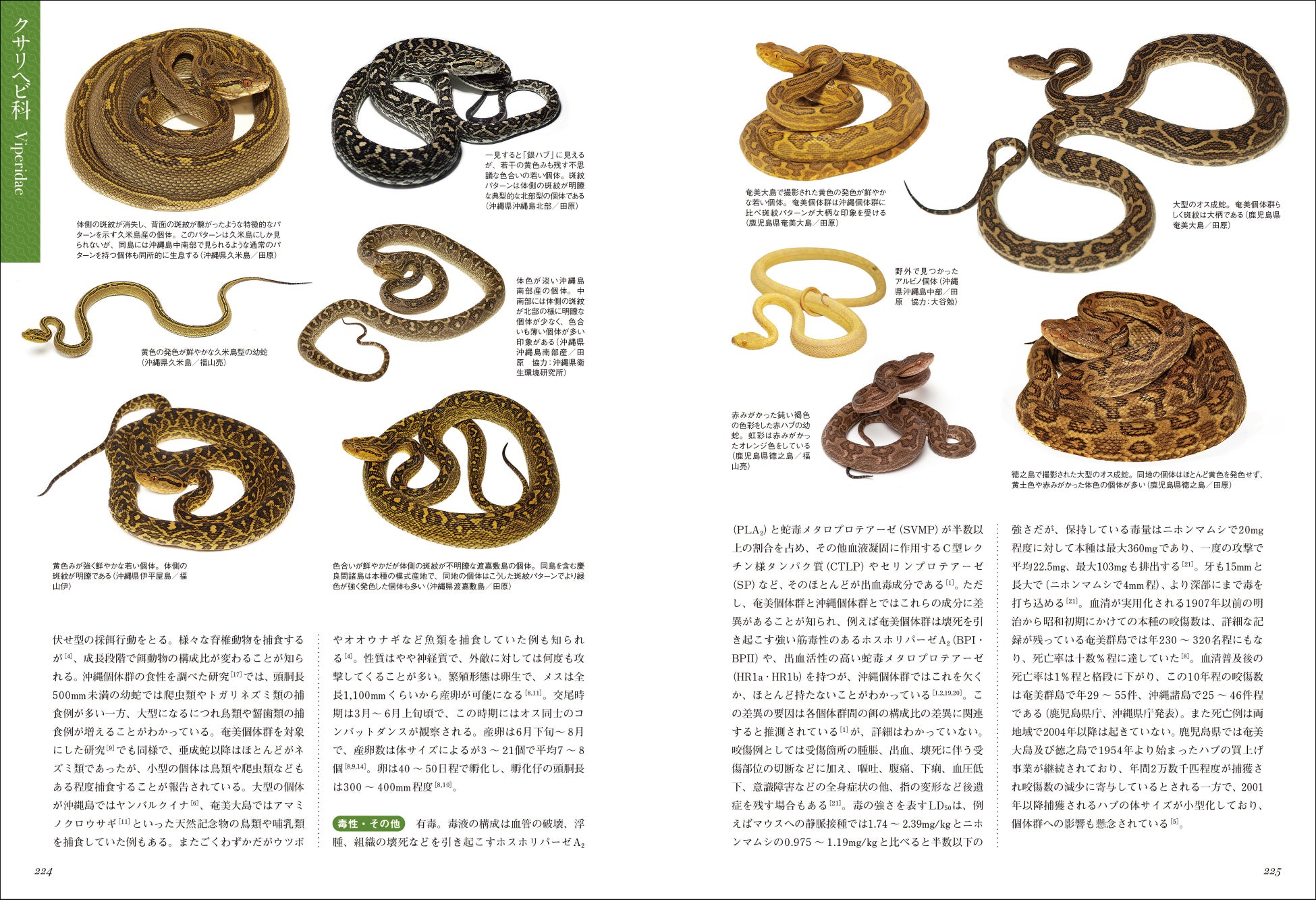 第2章では、メクラヘビ科、タカチホヘビ科、セダカヘビ科、ナミヘビ科、コブラ科、クサリヘビ科の6科ごとに、それぞれの種について、分類、分布、形態、生態、毒性などを解説。