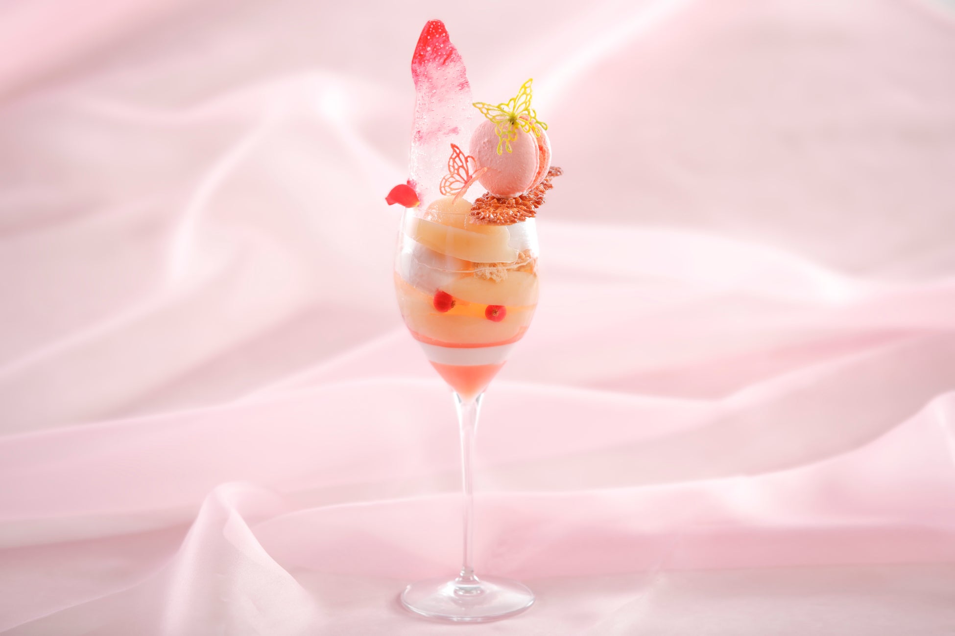 毎月テーマを替えてお届けするパルミエールのパフェ。7月のテーマは『桃』。トップには蝶のモチーフを配し華やかさを演出します。ジューシーな白桃を一個分使用したパフェは、白桃と相性の良いアールグレイのパンナコッタとキャラメル掛けのナッツがアクセント。食べ進めると上品な風味の白桃のリキュールのジュレ、バニラアイスクリーム、桃のピューレの層が楽しめます。見た目も優美で爽やかな夏を感じる季節のパフェをご堪能ください。