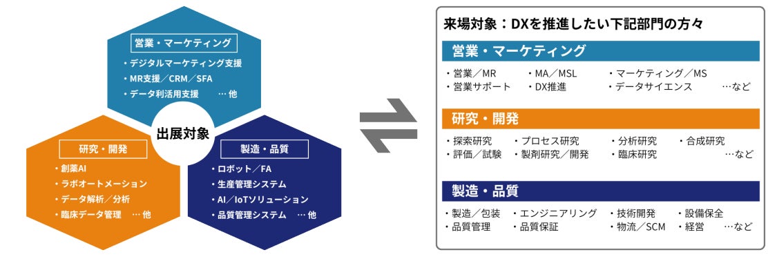 「インターフェックスWeek」内に新設!本展は、医薬品の研究・製造~営業・マーケティングに至る業界全体のDX推進を支援する展示会です。会場では各分野の最新ソリューションが一堂に会します。