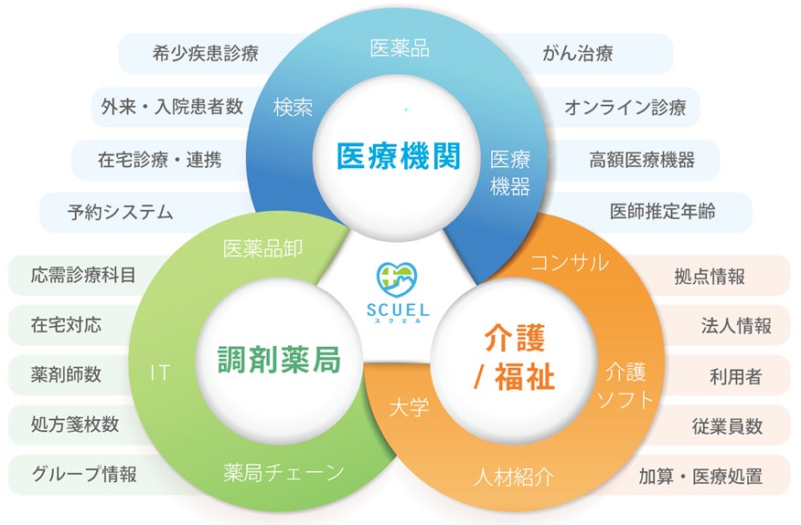 国内に存在するオープンデータを収集し、あらゆる項目を一つのIDに集約したSCUELデータベース。その項目数は医療機関だけで1000以上にわたります。医療制度や地域医療の変化を捉えながら、医療・介護業界の施設ターゲティングの精度向上を支援します。