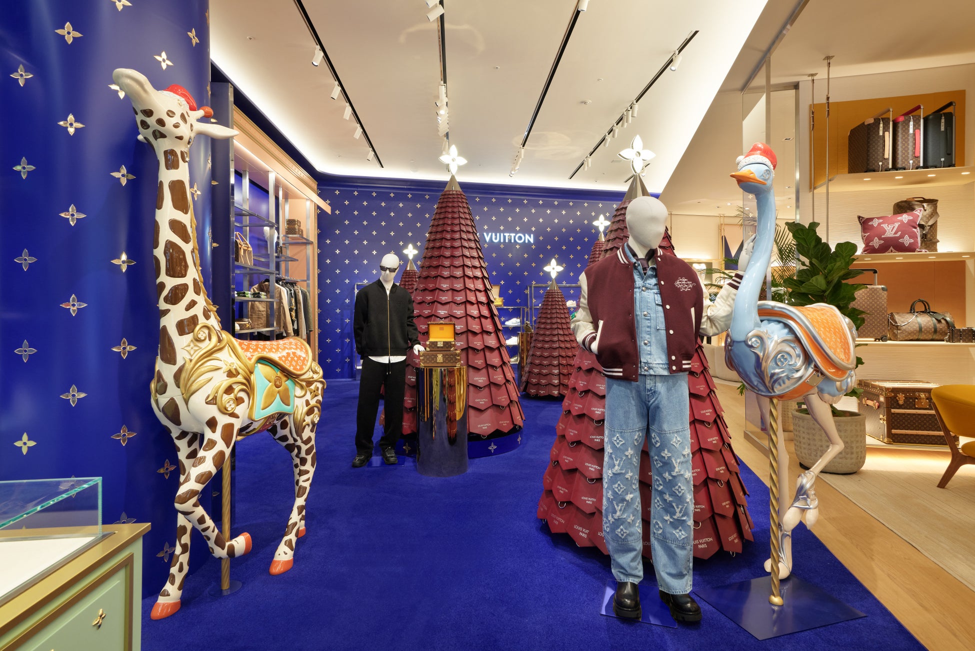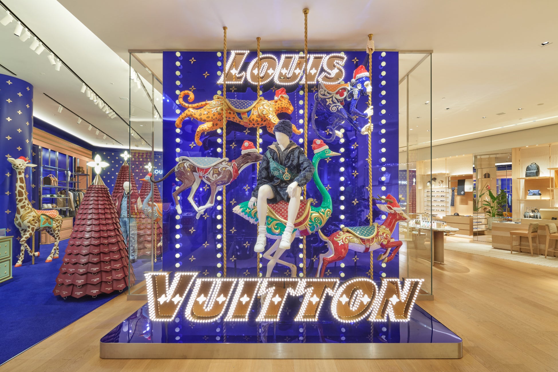 カルーセルをイメージした遊び心溢れるディスプレイが広がり、ポップアップスペースにはクリスマスツリーやキリンなども。