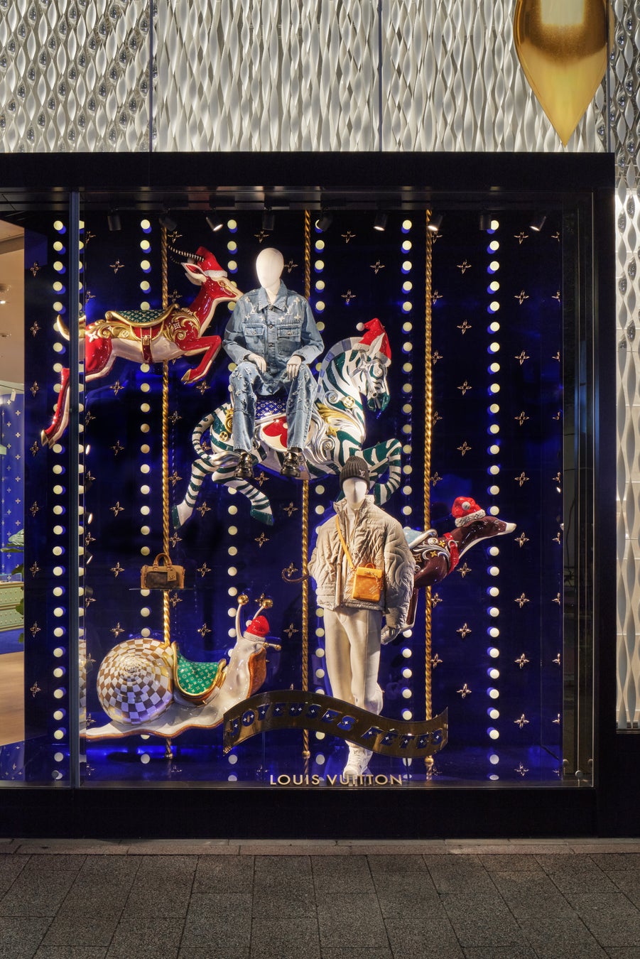 ルイ·ヴィトン 渋谷メンズ店では、ホリデーシーズンを彩る特別仕様のウィンドウ·ディスプレイとポップアップスペースが登場。今年は、1900年に創業者の息子 ジョルジュ·ヴィトンがパリ万国博覧会でトランクを展示した際のカルーセル風のセットがインスピレーション源となっています。