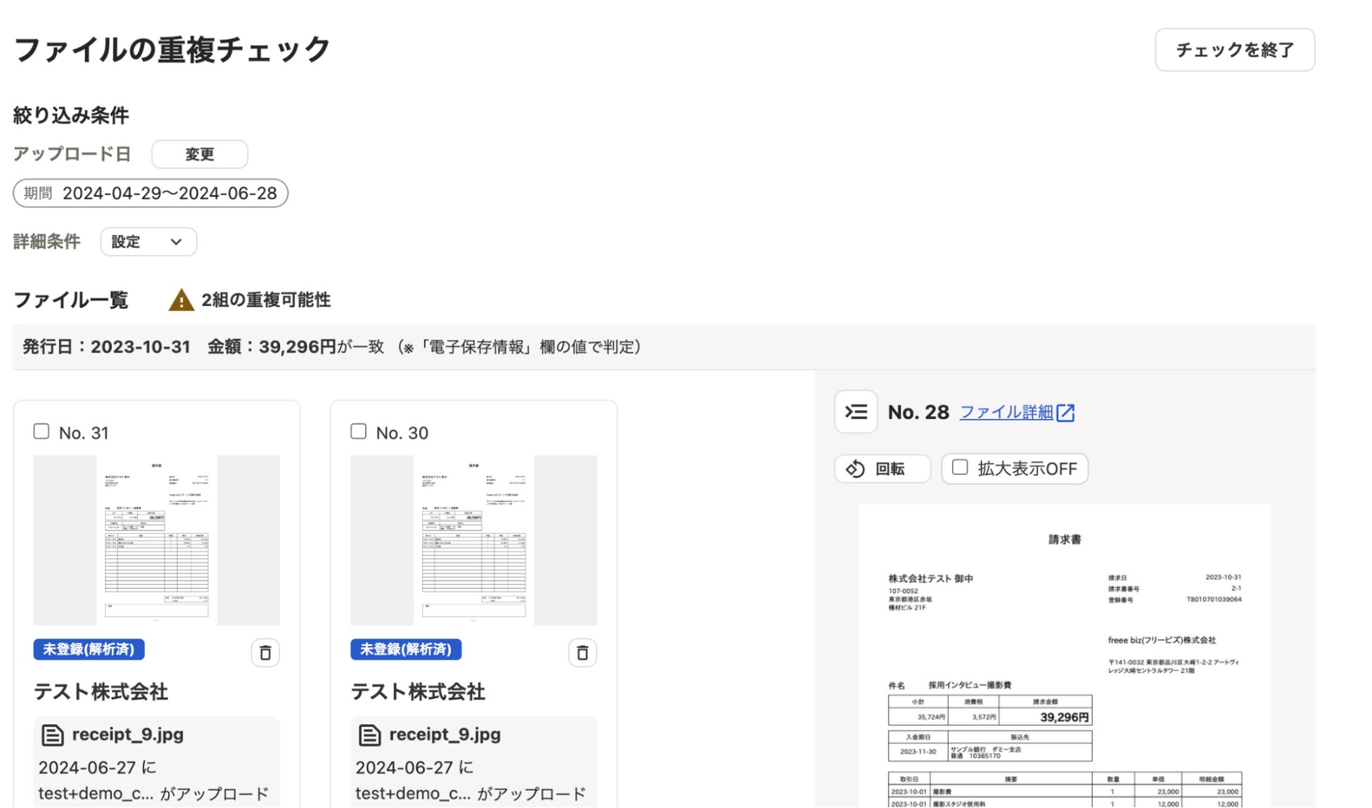 ■「ファイルの重複チェック機能」で同じ証憑を検知し、ミスを未然に防止
